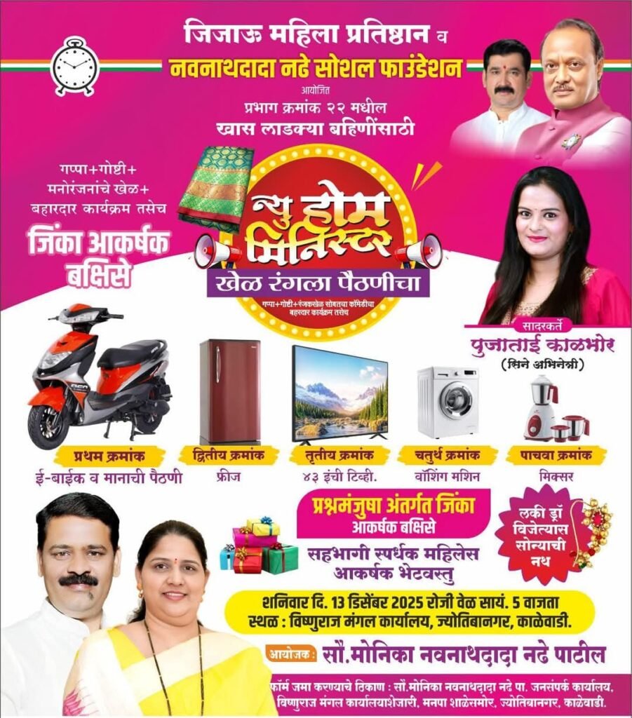 पिंपरी, (महाराष्ट्र ब्रेकिंग न्यूज) – काळेवाडी परिसरातील महिलांसाठी खास मनोरंजनात्मक व प्रोत्साहनपर उपक्रम म्हणून जिजाऊ महिला प्रतिष्ठान आणि नवनाथदादा नढे सोशल फाऊंडेशन यांच्या संयुक्त विद्यमाने ‘न्यू होम मिनिस्टर : खेळ रंगला पैठणीचा’ हा भव्य कार्यक्रम येत्या शनिवारी (दि. १३ डिसेंबर २०२५) आयोजित करण्यात आला आहे. सायंकाळी ठीक ५ वाजता विष्णुराज मंगल कार्यालय, ज्योतिबा नगर, काळेवाडी येथे हा कार्यक्रम पार पडणार आहे.