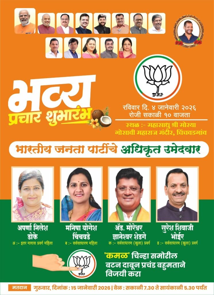 या प्रभागातून भाजपच्या अधिकृत उमेदवार म्हणून अपर्णा निलेश डोके (इतर मागास प्रवर्ग – महिला), मनिषा योगेश चिंचवडे (सर्वसाधारण महिला), ऍड. मोरेश्वर ज्ञानेश्वर शेडगे (सर्वसाधारण – खुला प्रवर्ग) आणि सुरेश शिवाजी भोईर (सर्वसाधारण – खुला प्रवर्ग) हे निवडणूक रिंगणात उतरले आहेत. चारही उमेदवारांनी ‘विकास, विश्वास आणि सक्षम नेतृत्व’ या मुद्द्यांवर प्रचाराची दिशा निश्चित केली आहे.