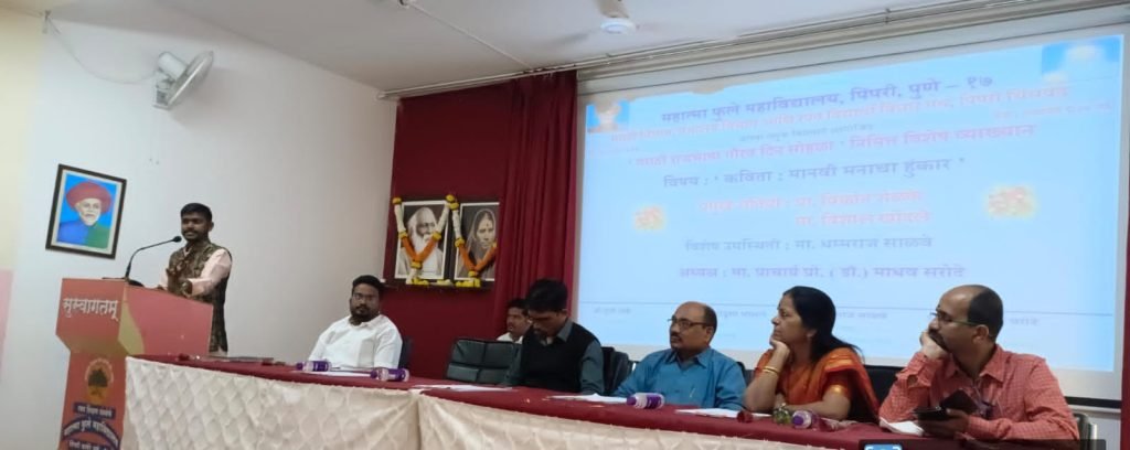 पिंपरी, ( महाराष्ट्र ब्रेकिंग न्यूज ) – येथील रयत शिक्षण संस्थेच्या महात्मा फुले महाविद्यालयात मराठी विभाग, ग्रंथालय विभाग आणि रयत विद्यार्थी विचार मंच यांच्या संयुक्त विद्यमाने कविश्रेष्ठ कुसुमाग्रज यांच्या जयंतीनिमित्त मराठी राजभाषा गौरव दिनाच्या कार्यक्रमाचे आयोजन करण्यात आले होते. या कार्यक्रमासाठी प्रमुख पाहूणे म्हणून प्रा.विक्रांत शेळके आणि मा. विशाल खोंदले उपस्थित होते.