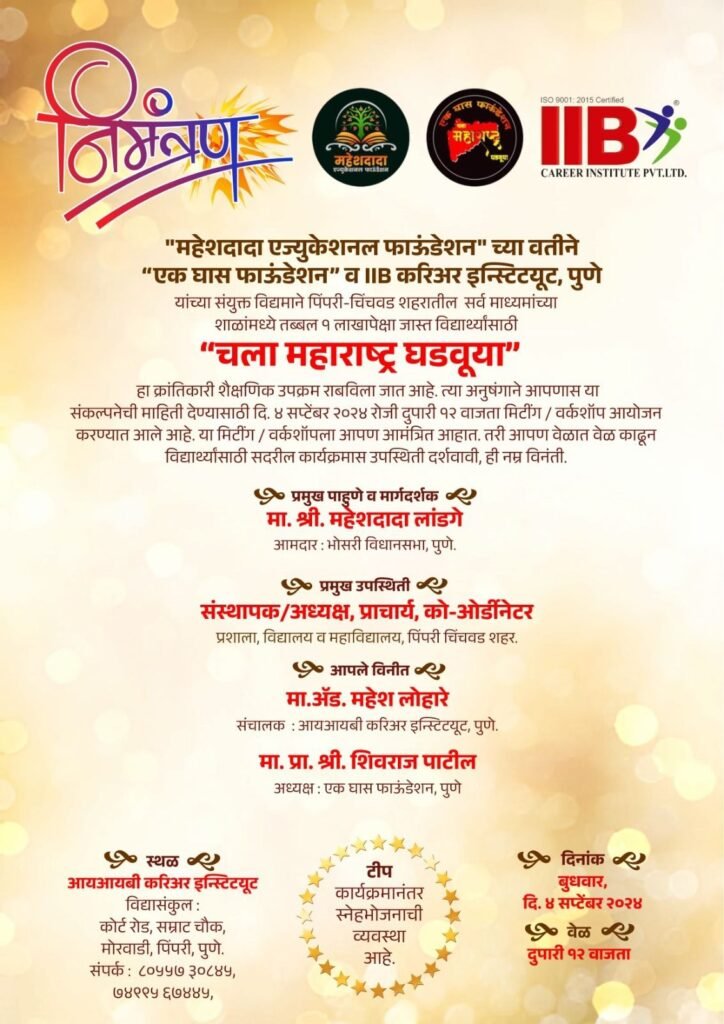 महेशदादा एजुकेशनल फॉउंडेशनचे अध्यक्ष आमदार महेश लांडगे, आयआयबी करिअर इन्स्टिटयूटचे संचालक ॲड. महेश लोहारे, तसेच एक घास फॉउंडेशनचे अध्यक्ष प्रा. शिवराज पाटील यांच्या मार्गदर्शनाखाली उपक्रमाचे आयोजन केले आले असून, पिंपरी-चिंचवड शहरातील सर्व माध्यमाच्या शाळांच्या संस्थापक / अध्यक्ष, प्राचार्य, कॉ- ऑर्डीनटोर यांना या क्रांतिकारी शैक्षणिक उपक्रमामध्ये सहभागी होऊन जास्तीत जास्त विद्यार्थ्यानं पर्यंत हा क्रांतिकारी शैक्षणिक उपक्रम पोहचवावा. तसेच, इच्छुक शाळांनी रजिस्ट्रेशनसाठी ७४९९५६७४४५ / ८०५५७३०८४५ या क्रमांकावर संपर्क करावा, असे आवाहन केले आहे.