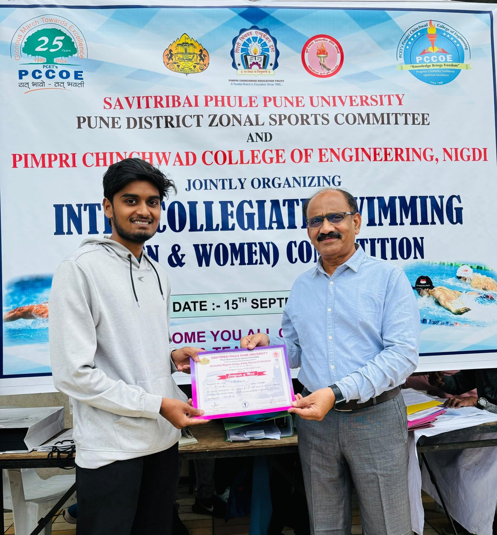 पिंपरी, (महाराष्ट्र ब्रेकिंग न्यूज ) – पिंपरी चिंचवड अभियांत्रिकी महाविद्यालय आणि पुणे जिल्हा विभागीय क्रीडा समिती, सावित्रीबाई फुले पुणे विद्यापीठ यांच्या संयुक्त विद्यमाने आंतर महाविद्यालयीन मुले, मुलींच्या पोहण्याच्या स्पर्धा बालेवाडी येथील श्री शिवछत्रपती क्रीडा संकुल येथे आयोजित करण्यात आल्या होत्या. या स्पर्धेत विजयी झालेल्या स्पर्धकांची विभागीय स्पर्धेसाठी निवड करण्यात आली. यामध्ये पृथ्वीराज चव्हाण (पीसीसीओई निगडी), अवधूत मोरे (कॉलेज ऑफ फार्मसी माळेगाव), शुभम धायगुडे (बीजी कॉलेज सांगवी), पार्थ चोपकर (बीजी कॉलेज, सांगवी), अथर्व भाकरे (एमपी कॉलेज पिंपरी), विशाल नरवडे (बीजी कॉलेज सांगवी), दीक्षा यादव (बीजी कॉलेज सांगवी), गरिमा कुशवाहा (इंदिरा कॉलेज परंदवडी), श्वेता कुऱ्हाडे (बीजी कॉलेज सांगवी), सायली झुंजाड (सिटी बोरा कॉलेज शिरूर), भक्ती वाडकर (बीजी कॉलेज सांगवी) यांचा समावेश आहे.