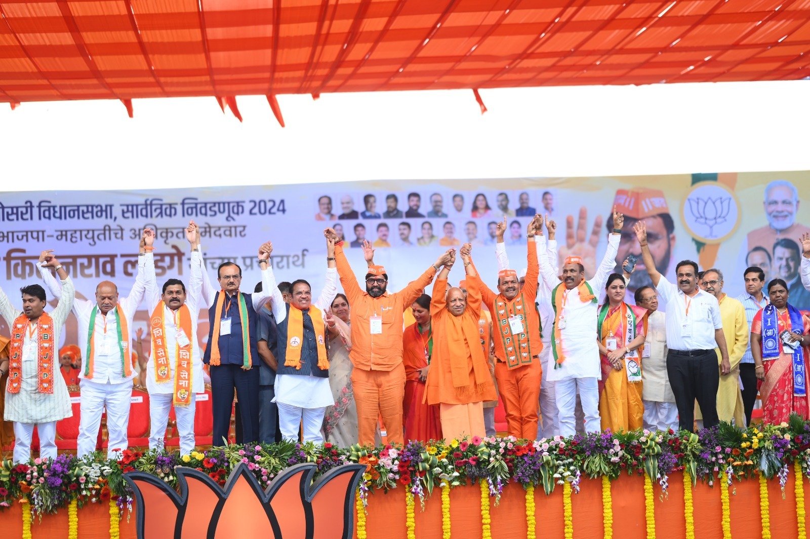 योगी आदित्यनाथ म्हणाले की, छत्रपती शिवाजी महाराज यांच्या पुण्यभूमिला नमन करतो. महाराष्ट्रात नवीन सरकार बनवण्यासाठी निवडणूक होत आहे. पंतप्रधान नरेंद्र मोदी यांच्या नेतृत्त्वात महायुती गठबंधन आहे. गेल्या १० वर्षांत नवा भारत निर्माण होत आहे. ‘सबका साथ सबका विकास’ या भावनेतून देशाची प्रगती सुरू आहे. कुणाचे तुष्टीकरण केले जात नाही. भारताला जोडणाऱ्या शक्ती ‘एक भारत श्रेष्ठ भारत’ विचाराने महागठबंधन म्हणून एकत्र आल्या आहेत. दुसऱ्या बाजुला ‘महाअनाडी गठबंधन’ आहे. ज्यांच्याकडे निती, नियत आणि निर्णय घेण्याची क्षमता आणि सामर्थ्य नाही. ‘‘सबका साथ लेकीन परिवारका विकास’’ असा ज्यांचा नारा आहे. त्यांनी भारताच्या विकासाचा विचार केला नाही.