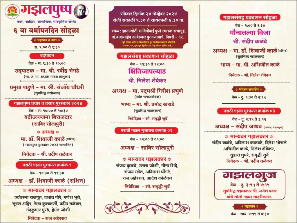 सोहळ्यात ज्येष्ठ गझलकार बदीऊज्जमा बिराजदार उर्फ साबीर सोलापुरी यांना गझलपुष्प पुरस्कार २०२४ प्रदान करून सन्मानित करण्यात येणार असून नीलेश शेंबेकर लिखित ‘क्षितिजापल्याड’ आणि संदीप कळंबे लिखित ‘मौनातल्या विजा’ या गझलसंग्रहांचे प्रकाशन मान्यवरांच्या हस्ते करण्यात येईल; तसेच सुमारे तीन गझल मुशायर्यांमधून एकूण पंचवीस गझलकार सहभागी होणार असून ‘गझलगुज’ या कार्यक्रमांतर्गत जयेश पवार यांच्या सोलो गझल सादरीकरणाने सोहळ्याची सांगता करण्यात येईल. नि:शुल्क असलेल्या या सोहळ्याचा लाभ सर्व रसिकांनी आवर्जून घ्यावा, असे आवाहन