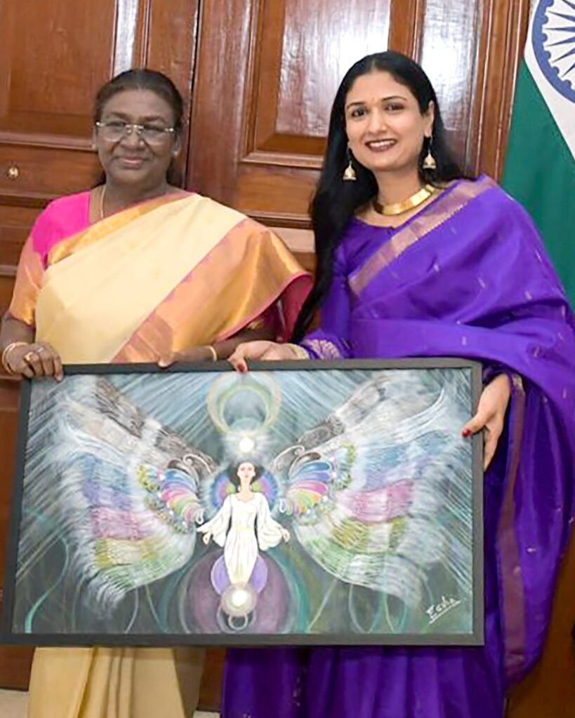 पुण्यातील युवा अभिनेत्री व औंध, बाणेर येथील प्रजापिता ब्रह्माकुमारी विश्वविद्यालयाची साधक ईशा अगरवाल हिने प्रियांका चोप्रा ची आई मधू चोप्रा, दीपक हारके यांच्या समवेत राष्ट्रपती द्रौपदी मुर्मु यांची दिल्लीमध्ये नुकतीच भेट घेतली. यावेळी ईशा अगरवाल हिने स्वतः काढलेले “एंजल” हे ॲक्रेलिक पेंटिंग राष्ट्रपती मूर्मु यांना भेट दिले. यावेळी राष्ट्रपतींनी ईशाला शुभ आशिर्वाद आणि पुढील कार्यास शुभेच्छा दिल्या.