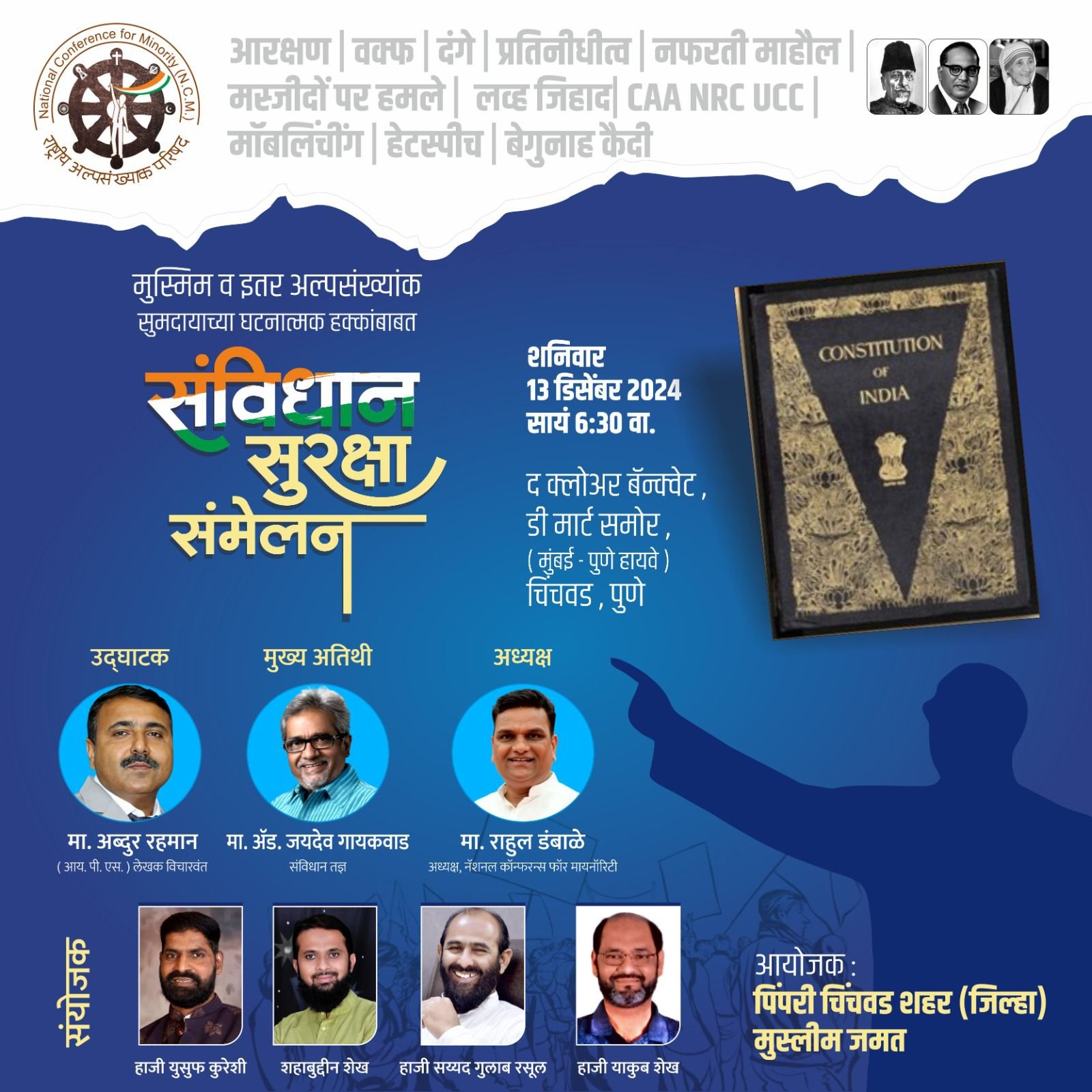 चिंचवड येथील मुंबई – पुणे महामार्गावरील हॉटेल, द क्लोअर बँक्वेट हॉल, (डी मार्ट शेजारी) येथे शुक्रवारी (दि.१३ डिसेंबर) सायंकाळी सहा वाजता या संमेलनाचे उद्घाटन निवृत्त आयपीएस अधिकारी जेष्ठ विचारवंत अब्दुर रहमान यांच्या हस्ते होणार आहे. माजी आमदार व संविधान तज्ञ ॲड. जयदेव गायकवाड हे प्रमुख पाहुणे तर नॅशनल कॉन्फरन्स फॉर मायनॉरिटी चे अध्यक्ष राहुल डंबाळे हे अध्यक्षस्थान भूषवणार आहेत. या संमेलनामध्ये आरक्षण, वक्फ बोर्ड, दंगे, प्रतिनिधित्व, नफरती माहोल, मज्जिदो पर हमला, लव जिहाद, सीएए, एनआरसी, युसीसी, हेटस्पीच, बेगुनाह कैदी या ज्वलंत विषयांवर संमेलनात चर्चा, मार्गदर्शन होणार आहे. या संमेलनास मुस्लिम तसेच अन्य अल्पसंख्यांक समुदायातील नागरिकांनी बहुसंख्येने उपस्थित रहावे असे आवाहन संयोजक हाजी युसुफ कुरेशी, शहाबुद्दीन शेख, हाजी सय्यद गुलाम रसूल, हाजी याकूब शेख यांनी केले आहे.