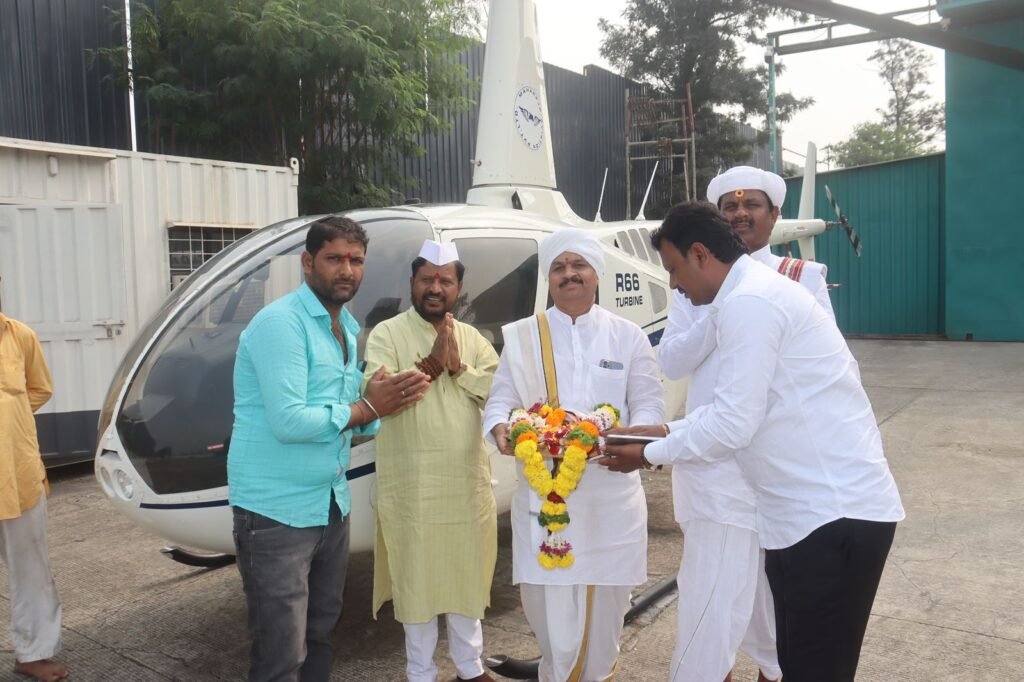 आळंदी ( महाराष्ट्र ब्रेकिंग न्यूज ) – जगतगुरु संत श्रेष्ठ श्री तुकाराम महाराज यांच्या त्रिशतकोत्तर अमृत महोत्सवी वैकुंठगमन वर्षा निमित्त आयोजित भव्य अखंड हरिनाम सप्ताह, संगीत गाथा पारायण सोहळ्यासाठी श्री संत तुकाराम महाराजांच्या पादुका श्री संत तुकाराम महाराज मंदिर येथून पुणे येथील कोरेगाव हेलिपॅड वरून संगमनेर येथील बोटा येथे रविवारी ( दि.22 ) हेलिकॉप्टरने हरिनाम गजरात रवाना झाल्या. पुणे ते बोटा या दरम्यान विविध मंदिरांवर हेलिकॉप्टरने पुष्पवृष्टी करण्यात आली. यावेळी जगद्गुरु संत तुकाराम महाराजांचे ११ वे वंशज ह.भ.प. प्रशांत महाराज संभाजी मोरे देहूकर आणि यजमान आदर्श सरपंच जालिंदर गागरे यांच्या हस्ते पुष्पवृष्टी करण्यात आली. देहू येथील श्री संत तुकाराम महाराज मंदिरातून जगद्गुरु श्री संत तुकोबाराय यांच्या पवित्र वैभवी पादुका श्री क्षेत्र बोटा येथे तुकाराम महाराजांच्या त्रिशतकोत्तर अमृत महोत्सवी वर्षा निमित्त सुरु होणाऱ्या अखंड हरिनाम सप्ताह आणि संगीत गाथा परायण सोहळ्यामध्ये पादुका ठिकठिकाणी पुष्पवृष्टी करीत हेलिकॉप्टरने हरिनाम गजरात नेण्यात आल्या. श्रीक्षेत्र देहू येथून सकाळी श्रींचे वैभवी पादुका कोरेगाव पार्क येथील हेलिपॅडवर हरिनाम गजरात वाहनाने पोहोचल्या.