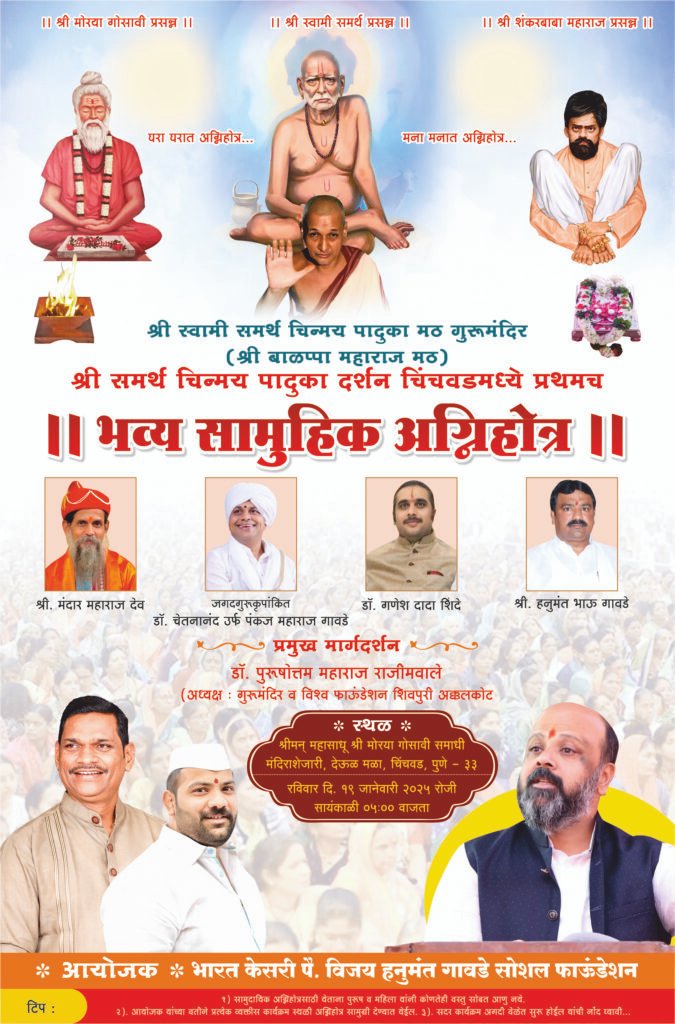 श्री स्वामी समर्थ चिन्मय पादुका मठ, गुरुमंदिर (श्री बाळाप्पा महाराज मठ) यांच्या सहकार्याने यानिमित्त चिंचवडगाव, श्रीमंन महासाधू श्री मोरया गोसावी समाधी मंदिर शेजारी देऊळ मळा येथे प्रथमच भव्य सामूहिक अग्निहोत्र होणार आहे. यावेळी अक्कलकोट येथील गुरुमंदिर व विश्व फाउंडेशन शिवपुरीचे अध्यक्ष डॉ. पुरुषोत्तम महाराज राजीमवाले हे मार्गदर्शन करण्यात आहेत. तसेच आमदार शंकर जगताप, मंदार देव महाराज, डॉ. चेतनानंद उर्फ पंकज महाराज गावडे, डॉ. गणेश दादा शिंदे, हनुमंत गावडे आदी मान्यवर उपस्थित राहणार आहेत. तसेच चिंचवड गावातील अध्यात्मिक क्षेत्रातील काही मान्यवर आणि गजानन विजय ग्रंथ २१ अध्याय मुखोद्गत असणारी कन्या सुरभी सुनील ढगे (वय ८ वर्षे) यांचा सत्कार करण्यात येणार आहे.