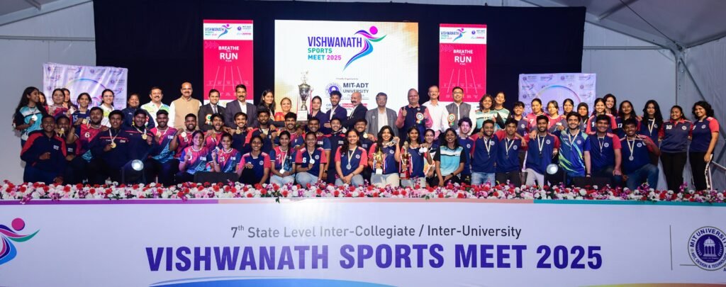 पुणे, (महाराष्ट्र ब्रेकिंग न्यूज ) – विश्वनाथ स्पोर्ट मीट-२०२५ या राज्यस्थरिय आंतरमहाविद्यालयीन/ आंतरविद्यापीठीय क्रीडा स्पर्धेत यजमान एमआयटी आर्ट, डिजाईन व टेक्नाॅलाॅजी विद्यापीठ, विश्वराजबाग, पुणेच्या खेळाडूंनी जबरदस्त कामगिरी करताना तब्बल १४ सुवर्ण व १८ रौप्यपदकांसह पदकतालिकेतील वर्चस्वासह आपले विजेतेपद राखले. एमआयटी एडीटी पाठोपाठ एमआयटी डब्लूपीयू संघाने एकूण ११ सुवर्ण व ६ रौप्य पदकांसह दुसरा तर सर परशूराम महाविद्यालय (स.प.) संघाने ६ सुवर्ण व ३ रौप्यपदकांसह स्पर्धेत तिसरा क्रमांक पटकाविला. एमआयटी एडीटी विद्यापीठाने गतवर्षीही वर्चस्व गाजविताना विजेतेपद पटकाविले होते.