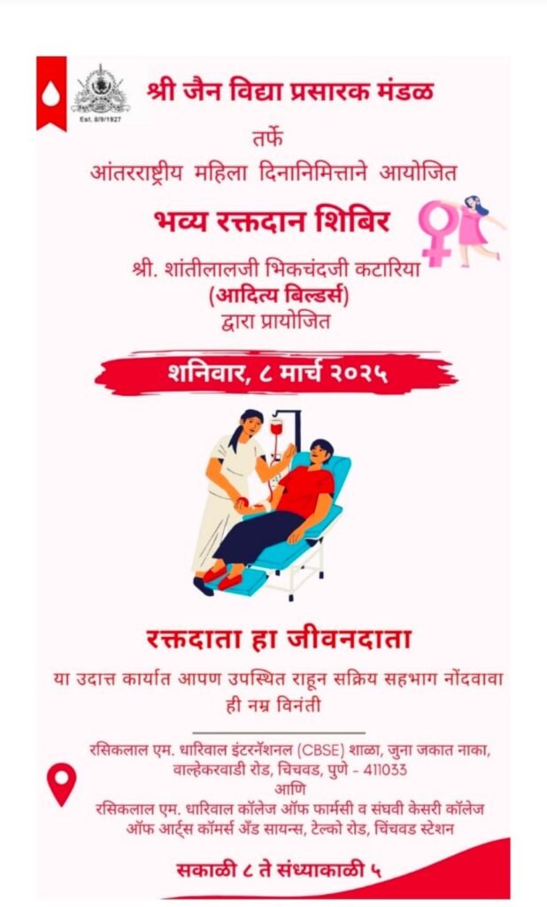 पिंपरी,(महाराष्ट्र ब्रेकिंग न्यूज) – श्री जैन विद्या प्रसारक मंडळाच्या वतीने जागतिक महिला दिनानिमित्त ८ मार्च रोजी रक्तदान शिबिराचे आयोजन करण्यात आले आहे. ‘रक्तदान हे सर्वश्रेष्ठ दान ! राष्ट्रासाठी रक्तदान, स्त्रियांच्या सन्मानासाठी रक्तदान, गरजूंसाठी रक्तदान!’ या संकल्पनेला पुढे नेत हा उपक्रम आयोजित करण्यात आला आहे.
