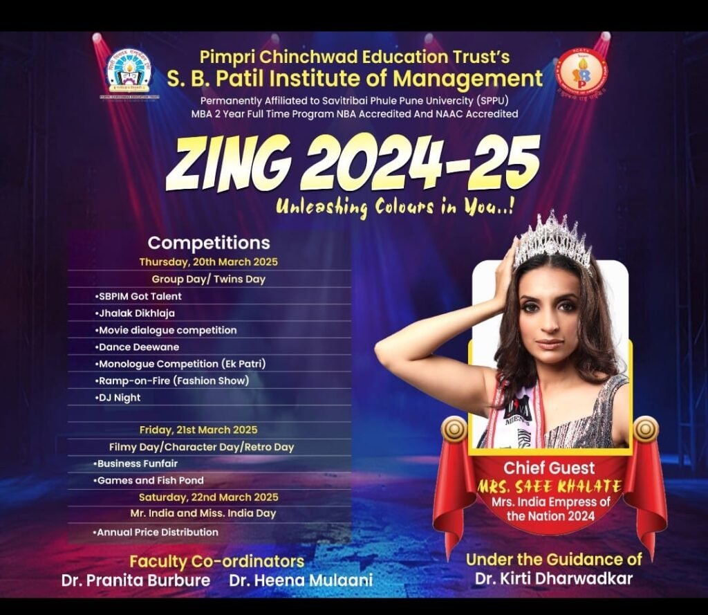 पिंपरी,(महाराष्ट्र ब्रेकिंग न्यूज) – पिंपरी चिंचवड एज्युकेशन ट्रस्टच्या एस. बी. पाटील इन्स्टिट्यूट ऑफ मॅनेजमेंट (एसबीपीआयएम) येथे “झिंग २०२५” हा सांस्कृतिक कार्यक्रम, विविध बौद्धिक स्पर्धा आणि वार्षिक पारितोषिक वितरण समारंभ आयोजित करण्यात आला आहे. याचे उद्घाटन प्रसंगी गुरुवारी (दि.२० मार्च) “मिसेस इंडिया २०२४” या फॅशन शोमध्ये प्रथम रणरअप झालेल्या सई खलाटे आणि शनिवारी (दि. २२ मार्च) वार्षिक पारितोषिक वितरण समारंभास चित्रपट अभिनेते अनिल गवस हे प्रमुख पाहुणे म्हणून उपस्थित होणार आहेत. एसबीपीआयएम व्यवस्थापन कौशल्य व संशोधनाला प्रोत्साहन देणारी राष्ट्रीय स्तरावर मान्यता प्राप्त व्यवस्थापन संस्था आहे. विद्यार्थ्यांचा सर्वांगीण विकास हा दृष्टिकोन समोर ठेवून, झिंग या सांस्कृतिक कार्यक्रमांमध्ये विद्यार्थ्यांना व्यावसायिक, उद्योजक आणि सामाजिक जबाबदारीचे भान रुजवणे, त्यांना व्यवस्थापन आणि संशोधन करण्यासाठी प्रोत्साहन देणे अशा बौद्धिक स्पर्धा यावेळी घेण्यात येणार आहेत.