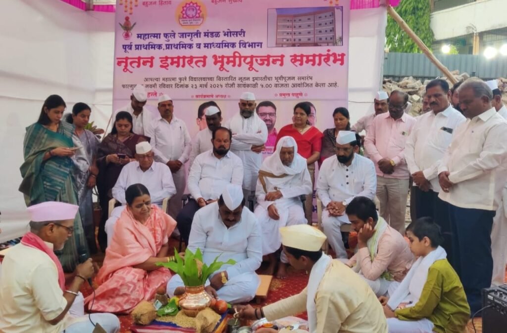 भोसरी येथील महात्मा फुले जागृती मंडळाच्या पूर्व प्राथमिक, प्राथमिक व माध्यमिक विभाग, महात्मा फुले विद्यालयाच्या नूतन इमारतीचे भूमीपूजन रविवारी (दि. २३ मार्च) शांतीब्रह्म गुरुवर्य हभप मारोती महाराज कुऱ्हेकर यांच्या हस्ते भोसरी येथे करण्यात आले. यावेळी खासदार श्रीरंग बारणे, आमदार महेशदादा लांडगे, संस्थेचे अध्यक्ष वसंत नाना लोंढे, सचिव संतोष लोंढे, उपाध्यक्ष अनिल लोंढे, विश्वनाथ लोंढे, सुरेश तात्या म्हेत्रे, योगेश लोंढे, शुभांगी लोंढे, सुरेखा लोंढे, विलास मडेगिरी, नम्रता लोंढे, सोनाली गव्हाणे, शंकर देवरे, हनुमंत लोंढे, सखाराम लोंढे, शाम गायकवाड, मुरलीधर साठे, शरद कर्णवर, दिगंबर ढोकले, मुख्याध्यापक मोहन वाघुले, मुख्याध्यापिका सुलभा चव्हाण, मंगल आहेर आदी उपस्थित होते.