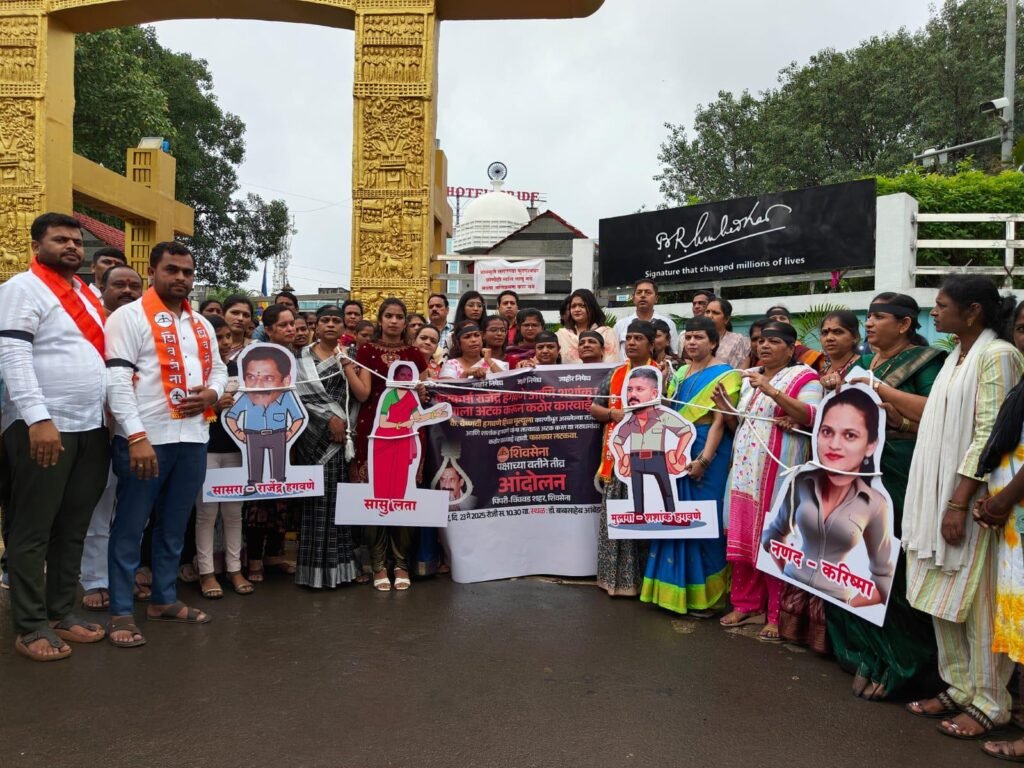 पिंपरी, (महाराष्ट्र ब्रेकिंग न्यूज) – कौटुंबिक हिंसाचाराची बळी ठरलेल्या वैष्णवी हगवणे हिला न्याय मिळावा. यासाठी शिवसेनेच्यावतीने पिंपरी येथे तीव्र आंदोलन करण्यात आले. या आंदोलनामध्ये युवतींकडून आरोपींना प्रतिकात्मक फाशी देण्यात आली. वैष्णवीच्या मारेकर यांना फाशी किंवा जन्मठेपेची शिक्षा व्हावी अशी मागणी यावेळी करण्यात आली. दरम्यान वैष्णवीला न्याय मिळवा यासाठी हा खटला फास्टट्रॅक न्यायालयात चालवण्यात यावा अशी देखील अपेक्षा व्यक्त करण्यात आली आहे.