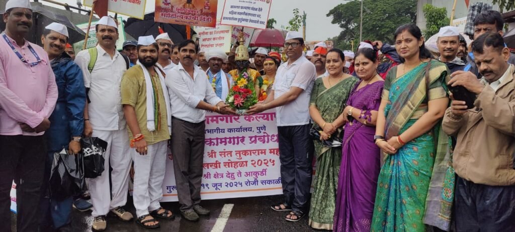 चिंचवड, (महाराष्ट्र ब्रेकिंग न्यूज) – महाराष्ट्र कामगार कल्याण मंडळ,पिंपरी-चिंचवड शहर यांच्या वतीने जगद्गुरु संत तुकाराम महाराज यांच्या ३४० व्या पंढरपूर पालखी प्रस्थान सोहळ्यात “कामगार प्रबोधन दिंडी”चे आयोजन करण्यात आले.श्री क्षेत्र देहूपासून आकुर्डी तुळजा भवानी मंदिरापर्यंत काढण्यात आलेल्या या दिंडीत शेकडो कामगार, व महिला त्यांच्या कुटुंबियांसह सहभागी झाले.