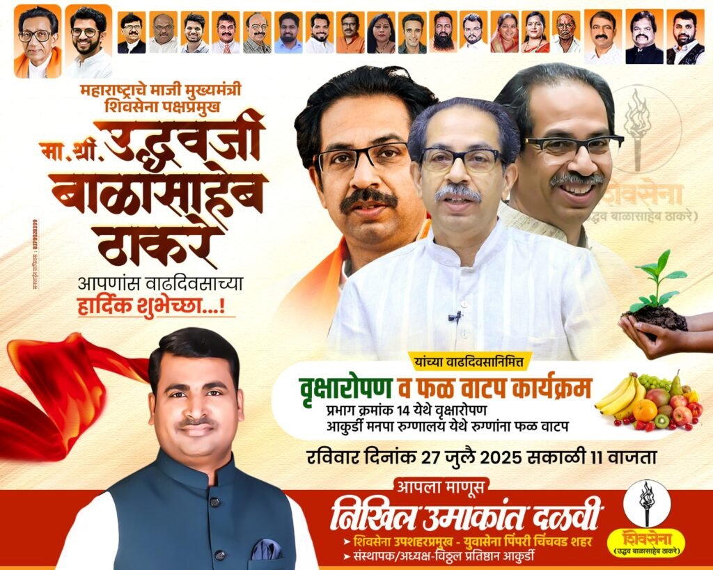 आकुर्डी,(महाराष्ट्र ब्रेकिंग न्यूज) – माजी मुख्यमंत्री शिवसेना पक्षप्रमुख उद्धव बाळासाहेब ठाकरे यांच्या वाढदिवसानिमित्त प्रभाग क्रमांक १४ आकुर्डी येथे आज रविवारी दि. २७ जुलैला विविध कार्यक्रम होणार आहे, अशी माहिती शिवसेना उपशहरप्रमुख निखिल दळवी यांनी दिली.