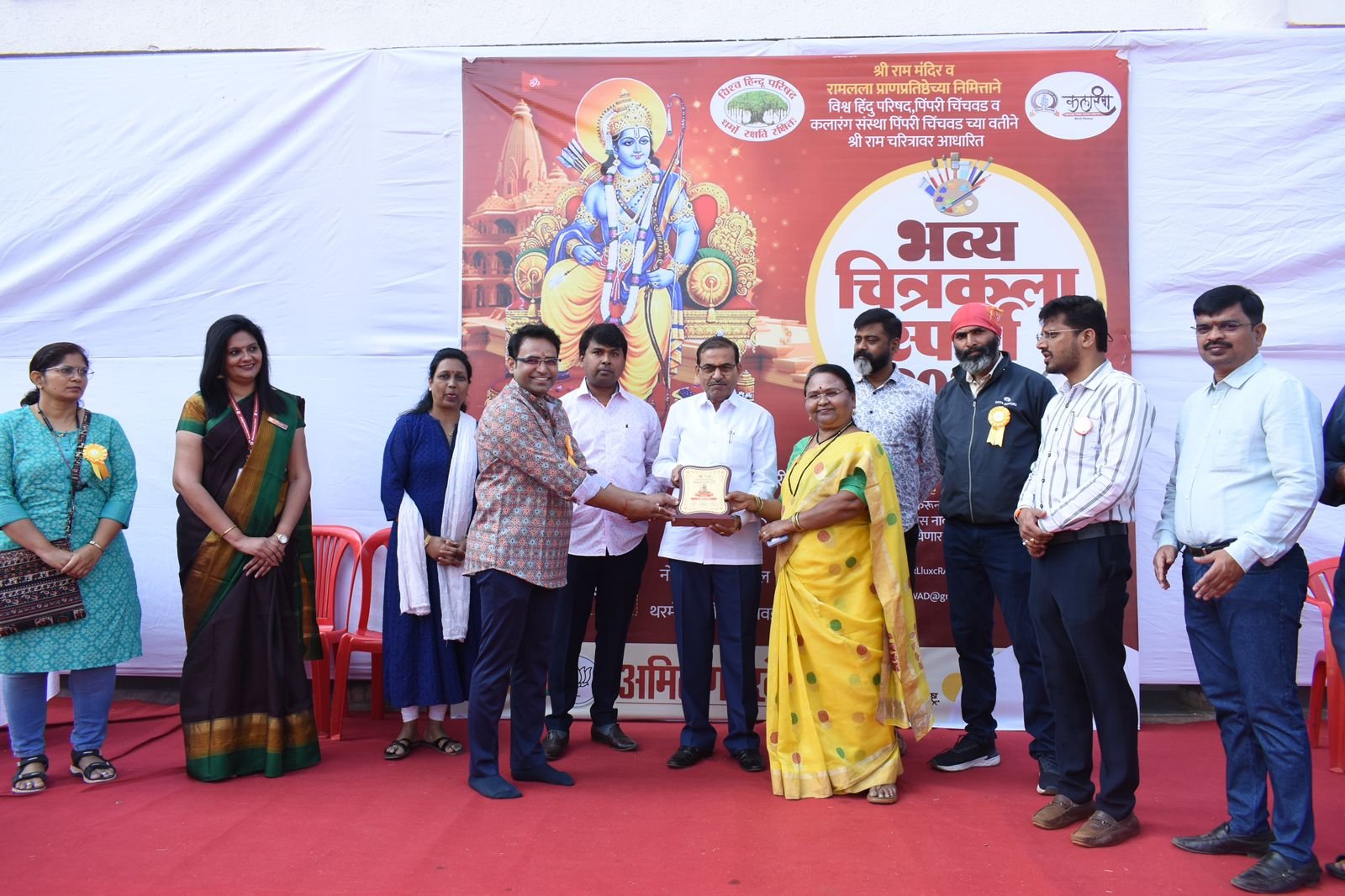 यावेळी कलारंग चे अध्यक्ष श्री अमित गोरखे यांच्या संकल्पनेतून तसेच विश्व हिंदू परिषद पिं.चिं चे अध्यक्ष श्री धनंजय गावडे यांच्या सहयोगाने या भव्य चित्रकलेचे स्पर्धेचे आयोजन करण्यात आले होते. 22 जानेवारी 2024 रोजी आयोध्येत प्रभू श्री राम यांचे भव्य दिव्य असे मंदीर उभारले जात आहे त्या मंदिरात प्रभू श्री रामांची प्राणप्रतिष्ठा होत आसताना पिं.चिं शहरात असा भव्य उपक्रम घेण्यात आला. लहान मुलांपासून ते जेष्टां पर्यंत संपुर्ण वातावरण राममय झाले होते. या स्पर्धेला विशेष बक्षिस देखील ठेवण्यात आले आहे, या स्पर्धेत प्रथम पारितोषिक दिवंगत आमदार कै. लक्ष्मणभाऊ जगताप यांच्या स्मरणार्थ रोख १५,००० रुपये व स्मृतिचिन्ह, द्वितीय पारितोषिक कै. हिराबाई किसनराव लांडगे यांच्या स्मरणार्थ रूपये १०,००० रुपये व स्मृतिचिन्ह, तृतीय पारितोषिक कै. गणपतराव गोरखे यांच्या स्मरणार्थ रोख ७,५०० रुपये व स्मृतिचिन्ह, चतुर्थ पारितोषिक कै.सुरेश गादिया यांच्या स्मरणार्थ रोख ५,००० रुपये व स्मृतीचिन्ह, कै. सुनंदा यशवंत मिठभाकरे यांच्या स्मरणार्थ रोख २१०० रुपये व स्मृतिचिन्ह ठेवण्यात आले आहे. आशा स्वरुपाचे बक्षिस ठेवण्यात आली आहे व लवकरच या बक्षिसांचे वितरण देखील करण्यात येणार.तसेच या सर्व चित्रांचे प्रदर्शन देखील ठेवण्यात येणार आहे. या स्पर्धेला विशेष मान्यवर उपस्थीत होते त्या मधे रा.स्व.संघाचे हेमंत हरहरे, निगडी प्राधिकरण माजी अध्यक्ष सदाशिव खाडे, पिं.चि विश्व हिंदू परिषद अध्यक्ष धनंजय गावडे, जिल्हा सहमंत्री विशाल मासुळकर, विभाग मंत्री नितीन वाटकर, मा.नगरसेविका अनुराधा ताई गोरखे, पिं.चिं भाजपा उपाध्यक्ष राजु दुर्गे, भाजपा पदाधिकारी कैलास कुटे,गणेश लंगोटे,मनिषा शिंदे,उपस्थित होते ,या स्पर्धेला परीक्षक म्हणून प्रसिद्ध फोटोग्राफर देवदत्त कशाळीकर, प्रसिद्ध चित्रकार सुनील शेगावकर, सुमित काटकर, जोती कुंभार यांनी परिक्षण केले. लहान मुलांनी अतिशय अभ्यासपूर्वक चित्र काढली.