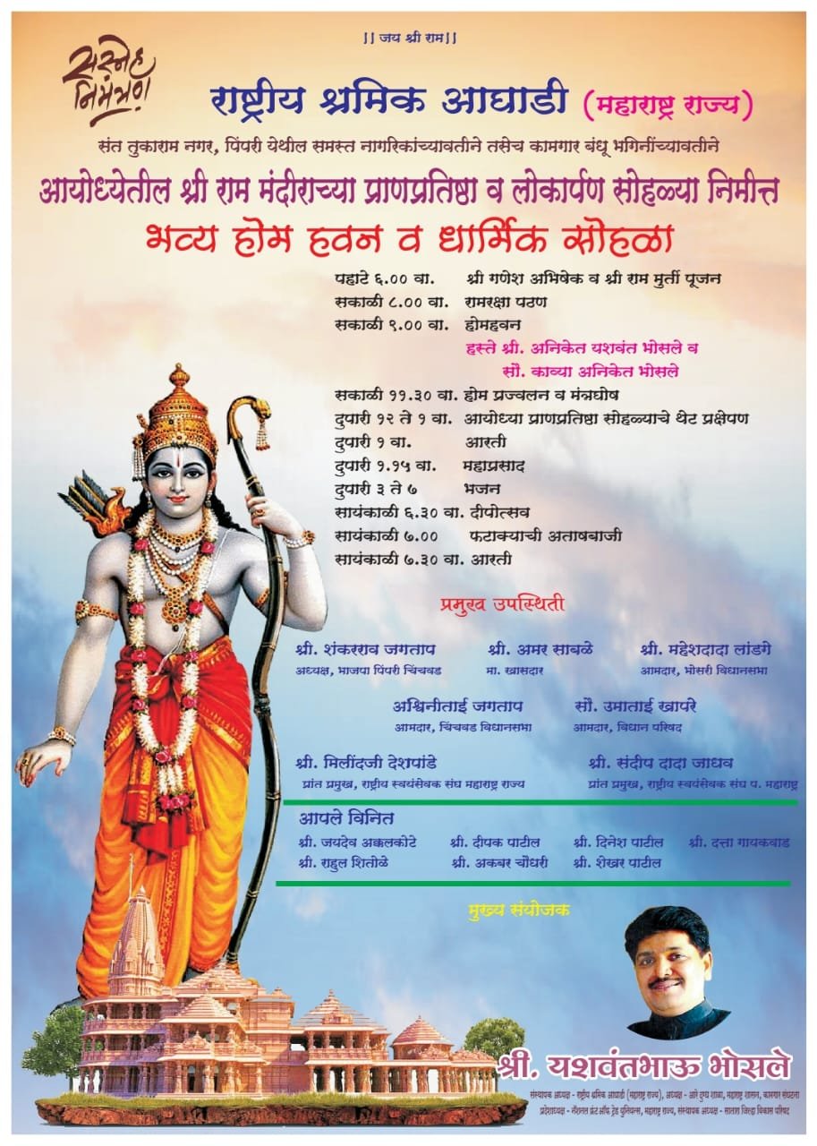 पिंपरी, (महाराष्ट्र ब्रेकिंग न्यूज) – शेकडो वर्षांच्या प्रतीक्षेनंतर अयोध्येत प्रभू श्रीराम यांच्या मंदिराची स्थापना झाली असून सोमवार दि.22 जानेवारी 2024 रोजी अयोध्येत श्रीरामलल्लांचा प्राणप्रतिष्ठापना सोहळा पार पडणार आहे. त्यानिमित्ताने पिंपरीत राष्ट्रीय श्रमिक आघाडीच्या वतीने दिवसभर धार्मिक, सामाजिक व सांस्कृतिक कार्यक्रमांचे आयोजन करण्यात आले असल्याची माहिती, राष्ट्रीय श्रमिक आघाडीचे अध्यक्ष यशवंतभाऊ भोसले यांनी दिली.