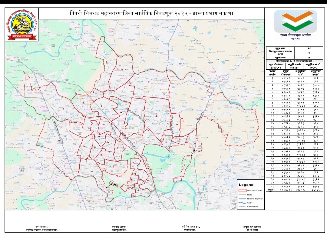 पिंपरी, (महाराष्ट्र ब्रेकिंग न्यूज) – पिंपरी-चिंचवड महापालिका निवडणुकिसाठी प्रभाग रचना निवडणूक विभागाने आज जाहीर केली. विशेष म्हणजे रचनेत कुठलाही फरक नसून २०१७ चीच रचना आहे तशीच कायम ठेवण्यात आली आहे.चार सदस्यांचा एक असे एकूण, ३२ प्रभाग आहेत त्यानुसार २०१७ च्या निवडणुकीप्रमाणेच ३२ प्रभाग आणि १२८ नगरसेवक असणार आहेत. प्रभाग क्रमांक नऊ हा सर्वाधिक लाेकसंख्येचा, तर प्रभाग क्रमांक पाच हा सर्वात कमी लाेकसंख्येचा आहे. या प्रभाग रचनेवर चार सप्टेंबरपर्यंत हरकती घेता येणार आहेत.