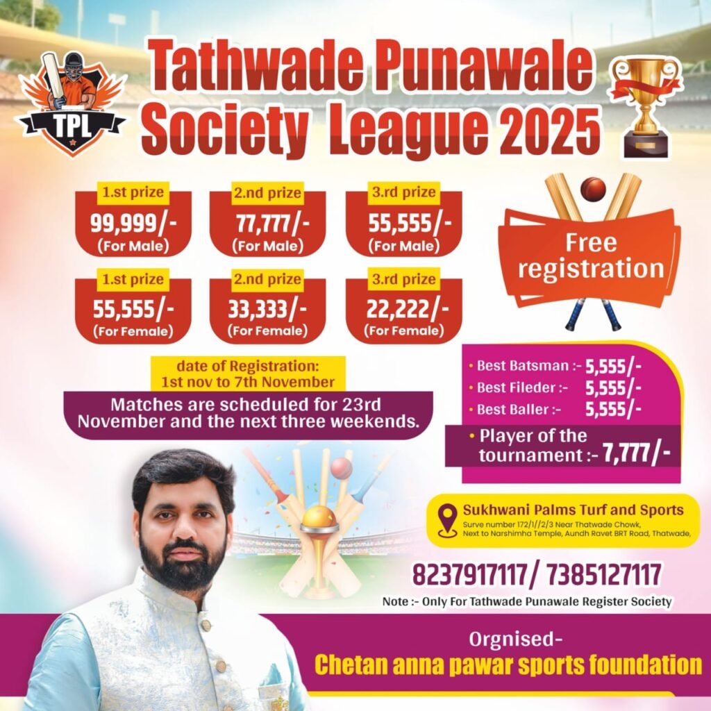 पिंपरी, (महाराष्ट्र ब्रेकिंग न्यूज) – ताथवडे-पुनावळे परिसर पुन्हा एकदा क्रिकेटच्या उत्साहाने रंगणार आहे! ताथवडे पुनावळे सोसायटी प्रीमियर लीग २०२५ (TPL 2025) या बहुप्रतिक्षित क्रिकेट स्पर्धेला रहिवाशांकडून उत्स्फूर्त प्रतिसाद मिळत असून, तब्बल ८२ संघांची नोंदणी पूर्ण झाली आहे. विशेष म्हणजे, यापैकी १२ महिला संघ आणि ७० पुरुष संघ स्पर्धेत सहभागी होणार आहेत.