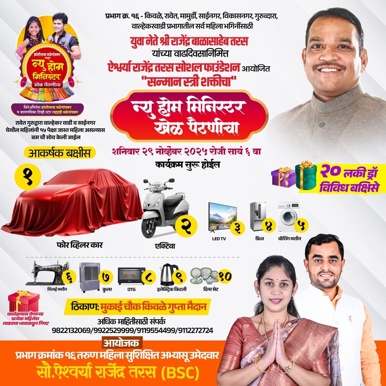 पिंपरी, (महाराष्ट्र ब्रेकिंग न्यूज) – शिवसेना युवा नेते राजेंद्र तरस यांच्या वाढदिवसानिमित्त शनिवार दि.२९ रोजी प्रभाग क्र.१६ किवळे, रावेत, मामुर्डी, साईनगर, विकास नगर, गुरुद्वारा, वाल्हेकरवाडी परिसरातील महिलांसाठी न्यू होम मिनिस्टर खेळ पैठणीचा या भव्य कार्यक्रमाचे आयोजन करण्यात आले आहे. या कार्यक्रमाचे विशेष आकर्षण म्हणजे प्रथम क्रमांकाच्या विजेत्या महिलेला ‘फोर व्हीलर कार’ बक्षीस स्वरूपात देण्यात येणार आहे.