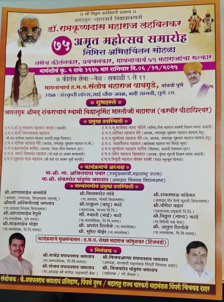 पिंपरी, (महाराष्ट्र ब्रेकिंग न्यूज) – पिंपळे गुरव येथील कै. गणपतराव जगताप प्रतिष्ठान व महाराष्ट्र राज्य वारकरी महामंडळ पिंपरी चिंचवड यांच्या वतीने जगदगुरू व्दाराचार्य विद्यावाचस्पती डॉ. रामकृष्णदास महाराज लहवितकर अमृत महोत्सवी वर्षानिमित्त ६ डिसेंबर रोजी अभिष्टचिंतन सोहळा, तसेच कीर्तनकार, प्रवचनकार, गायनाचार्य अशा ७५ महाराजांचा सत्कार समारंभ आयोजित करण्यात आला आहे.