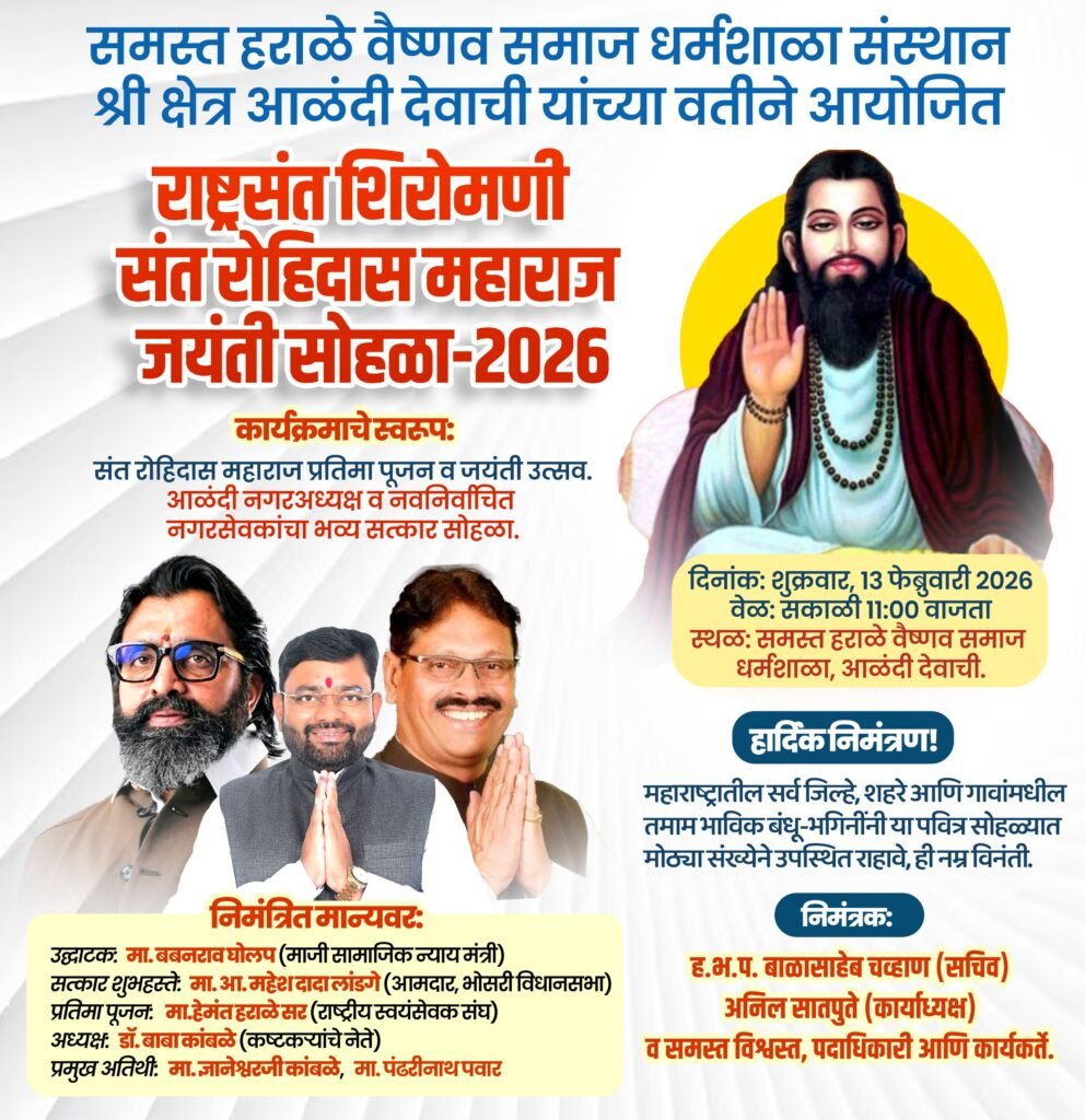 आळंदी, (महाराष्ट्र ब्रेकिंग न्यूज) – समस्त हराळे वैष्णव समाज धर्मशाळा संस्थान, श्री क्षेत्र आळंदी देवाची यांच्या वतीने राष्ट्रसंत शिरोमणी संत रोहिदास महाराज यांच्या जयंतीनिमित्त भव्य सोहळ्याचे आयोजन करण्यात आले आहे. शुक्रवार, दि. १३ फेब्रुवारी २०२६ रोजी संस्थेच्या आळंदी येथील धर्मशाळेत हा उत्सव उत्साहात साजरा होणार असल्याची माहिती संस्थेचे अध्यक्ष व कष्टकऱ्यांचे नेते डॉ. बाबा कांबळे यांनी दिली आहे.