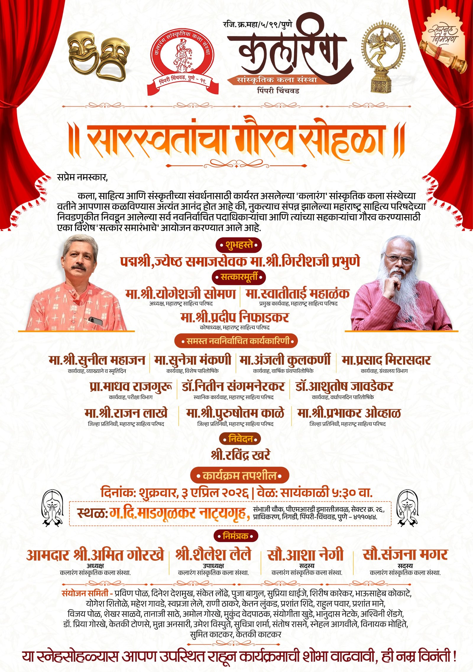 हा भव्य ‘सारस्वतांचा गौरव सोहळा’ येत्या शुक्रवार, ३ एप्रिल २०२६ रोजी सायंकाळी ५:३० वाजता, ग. दि. माडगूळकर नाट्यगृह, प्राधिकरण, निगडी येथे संपन्न होणार आहे.
