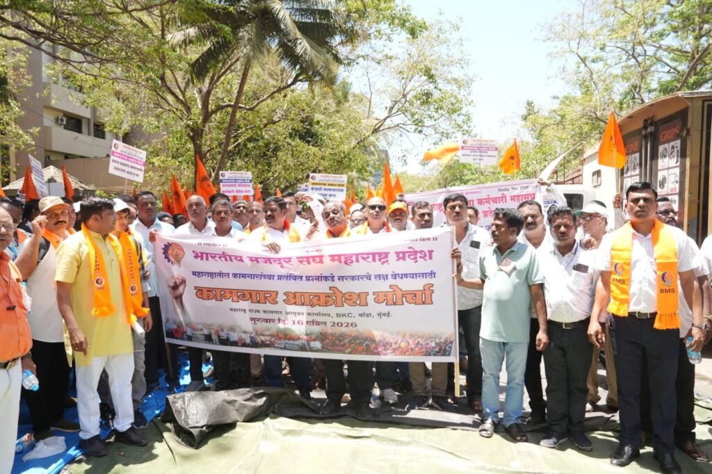 मुंबई, (महाराष्ट्र ब्रेकिंग न्यूज) – कृषी, आरोग्य, शिक्षण, महिला , युवा , उद्योग अशा विविध धोरणाप्रमाणे मागील अनेक वर्षांपासून आपल्या न्यायहक्कासाठी लढणाऱ्या महाराष्ट्रातील कष्टकरी ,श्रमिक कामगारांचे देखील धोरण तयार करून , कंत्राटी कामगारांना कंत्राटदार मुक्त सेवेसाठी हरियाणा पॅटर्न लागू करण्यात यावा यासह विविध मागण्यासाठी भारतीय मजदूर संघ महाराष्ट्र प्रदेशाने आपल्या विविध उद्योगातील कामगारांचा आज मुंबईतील वांद्रे स्थित कामगार आयुक्त कार्यालयावर हजारोंच्या संख्येने धडक आक्रोश मोर्चा आयोजित केला होता. या भव्यदिव्य अशा मोर्चामध्ये घरेलू, बांधकाम, अंगणवाडी , आशा वर्कर, रिक्षा टॅक्सी चालक, फेरीवाले, विडी कामगार, जलसेवा, नगरपालिका , औद्योगिक कामगार, सहकारी बँका, राष्ट्रीय बँक, विमा , पोस्ट, पोर्ट ट्रस्ट, रेल्वे, संरक्षण, माथाडी, एसटी महामंडळ, रुग्णालय , टोल , फवारणी कामगार , जिल्हा परिषद , RCF , HAL, पुणे मेट्रो, आदी आस्थापनातून सुमारे १० हजार कामगार सहभागी झाले होते.