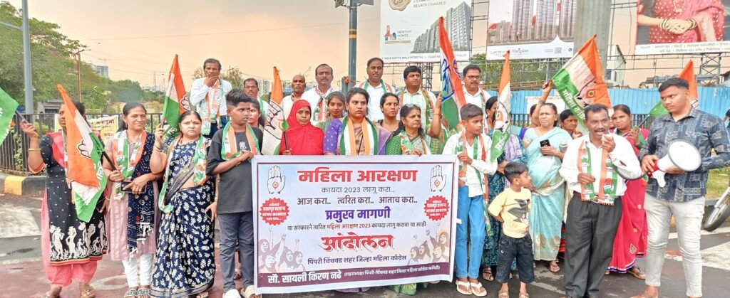 पिंपरी, (महाराष्ट्र ब्रेकिंग न्यूज) – ‘महिला आरक्षण विधेयक २०२३’ मंजूर होऊनही केंद्र सरकार त्याची अंमलबजावणी करण्यास टाळाटाळ करत असल्याचा आरोप करत, पिंपरी-चिंचवड शहर जिल्हा महिला काँग्रेस कमिटीच्या वतीने शुक्रवारी (दि.२४) काळेवाडी येथे जोरदार आंदोलन करण्यात आले. “महिला आरक्षणाच्या नावाखाली भाजप स्वतःची राजकीय पोळी भाजण्याचा प्रयत्न करत असून, हा महिलांची दिशाभूल करण्याचा प्रकार आहे,” अशा शब्दांत शहराध्यक्षा सायली किरण नढे यांनी सरकारवर प्रहार केला.