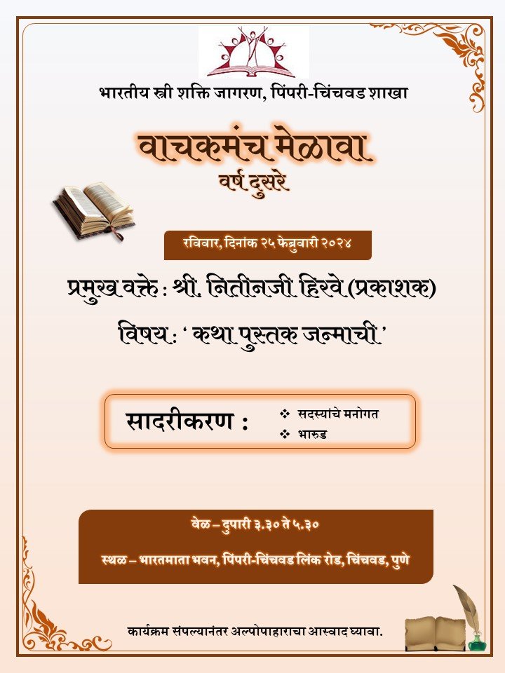 पिंपरी (महाराष्ट्र ब्रेकिंग न्यूज) – भारतीय स्त्री शक्ती जागरण, पिंपरी – चिंचवड शाखेच्या वतीने रविवार, दिनांक २५ फेब्रुवारी २०२४ रोजी दुपारी ठीक ३:३० ते ५:३० या कालावधीत भारतमाता भवन, स्वातंत्र्यवीर सावरकर मार्ग (पिंपरी – चिंचवड लिंक रोड), चिंचवड येथे वाचकमंच मेळावा आयोजित करण्यात आला आहे. मेळाव्याचे हे दुसरे वर्ष आहे. यामध्ये ज्येष्ठ प्रकाशक नितीन हिरवे ‘कथा पुस्तक जन्माची’ या विषयावर प्रकाशन क्षेत्रातील आपले रंजक अनुभव खुसखुशीत शैलीत मांडणार आहेत. तसेच भारूड सादरीकरण आणि सदस्यांचे मनोगत याचा श्रवणानंद मिळणार आहे. विनाशुल्क असलेल्या या कार्यक्रमाचा लाभ रसिकांनी आवर्जून घ्यावा, असे आवाहन संयोजकांनी केले आहे.