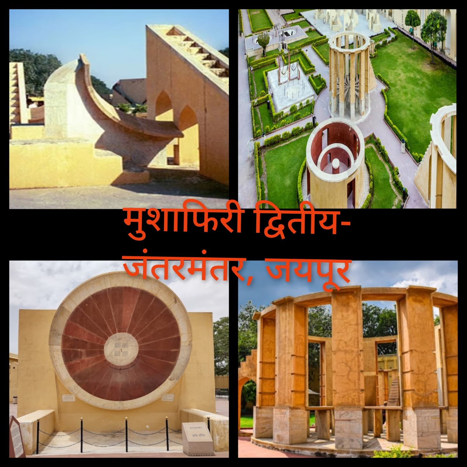 जयपूरमधील हवामहल पाहून आम्ही महाराजा सवाई जयसिंह यांनी निर्मिलेल्या जंतरमंतर या खगोलीय वेधशाळेच्या परिसरात येऊन पोहोचलो. जंतर म्हणजे यंत्र आणि मंतर म्हणजे गणना म्हणजेच हे गणनायंत्र होय. हिरवाईने नटलेल्या या विशाल परिसरात विविध आकारांच्या भव्य वास्तू म्हणजेच एकोणीस खगोलीय यंत्रे सूर्यप्रकाशात नहात डौलाने उभी होती. ही जगातील सर्वात मोठी दगडी खगोलीय वेधशाळा असून हिचा युनेस्कोच्या जागतिक वारसा यादीत समावेश झाला आहे. साधारणपणे तीनशे वर्षांपूर्वीच्या काळातील प्रगत खगोलशास्त्रीय ज्ञानाचे हे भांडार पाहून मन थक्क झाले. इथे पाषाण, संगमरवर, तांबे, लोखंडाचा वापर करून खगोल शास्त्रातील विविध संकल्पना साकारल्या आहेत. या आजही उत्तमरीत्या कार्यरत आहेत. प्रत्येक यंत्रासमोर संगमरवरी फलकावर माहिती दिली आहे. तसेच येथील मार्गदर्शक हे यंत्र कोणत्या संकल्पनेवर आणि कसे काम करते हे छान समजावून सांगत होते.