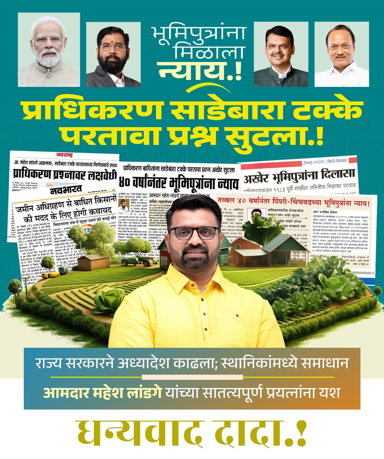 गेल्या ४० वर्षांपासून प्रलंबित प्राधिकरण बाधित १०६ शेतकरी कुटुंबांचा प्रश्नासाठी २०१४ पासून आम्ही तत्कालीन मुख्यमंत्री देवेंद्र फडणवीस यांच्या मार्गदर्शनाखाली पाठपुरावा करीत होतो. २०१९ मध्ये उपमुख्यमंत्री देवेंद्र फडणवीस यांनी याबाबत निर्णय घेतला होता. बाधित शेतकऱ्यांना सव्वा सहा टक्के जमीन आणि २ चा ‘एफएसआय’ असा साडेबाराटक्के परतावा देण्याच्या निर्णयाची अंमलबजावणी करण्यासाठी मंजुरी देण्याची घोषणा मुख्यमंत्री व दोन्ही उपमुख्यमंत्री यांच्या बैठकीत करण्यात आली. याबद्दल महायुती सरकारचे मनापासून आभार व्यक्त करतो.