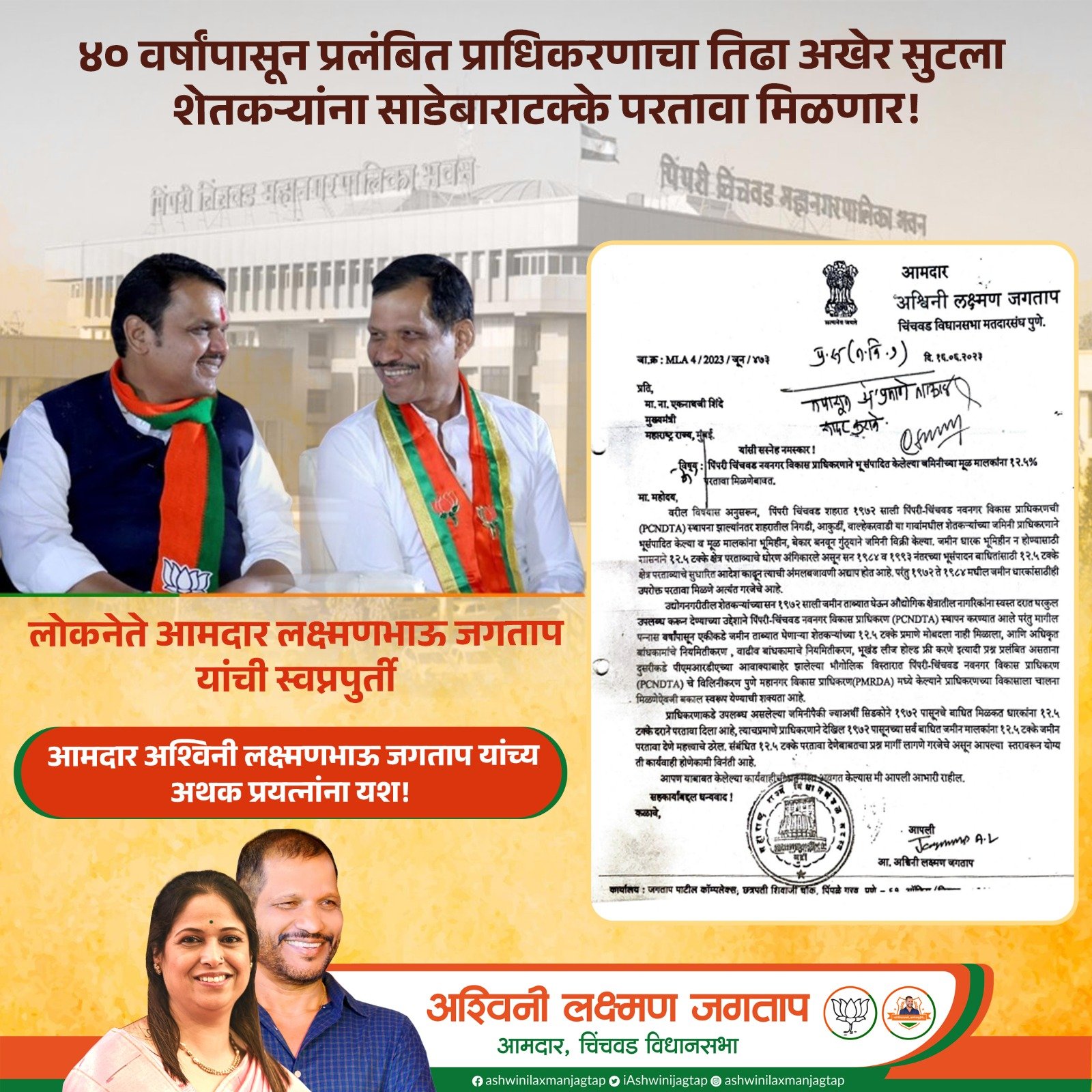 पिंपरी, (महाराष्ट्र ब्रेकिंग न्यूज) – गेल्या ४० वर्षांपासून प्रलंबित प्राधिकरण बाधित शेतकरी कुटुंबांचा प्रश्न सोडवण्यासाठी लोकनेते आमदार लक्ष्मणभाऊ जगताप पाठपुरावा करीत होते. त्यांचे अपुर्ण स्वप्न पुर्ण करण्यासाठी आमदार अश्वीनी जगताप यांनी मागणीचा पाठपुरावा केला आणि या प्रयत्नांना अखेर यश मिळाले आहे.