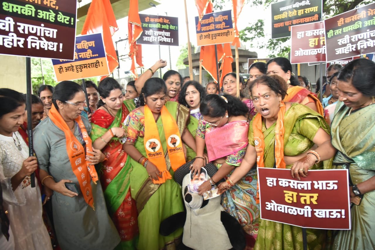 अमरावतीचे आमदार रवी राणा यांनी मुख्यमंत्री लाडकी बहीण योजनेवरून अमरावतीमध्ये नुकतेच एक वक्तव्य केले, ते म्हणाले होते की “विधानसभेसाठी तुमचे आशीर्वाद द्या अन्यथा तुमच्या खात्यातून दीड हजार रुपये पुन्हा काढून घेऊ.” या वक्तव्यानंतर राणा यांच्या विरोधात उद्धव बाळासाहेब ठाकरे शिवसेना महिला आघाडीच्या पदाधिकाऱ्यांनी संताप व्यक्त करत पिंपरी येथील अहिल्याबाई होळकर पुतळ्यासमोर ”जोडे मारो” आंदोलन केले. महिला आघाडीच्या पदाधिकाऱ्यांचे यावेळी रौद्ररूप पाहायला मिळाले. राणा यांचे वक्तव्य म्हणजे महिलांच्या स्वाभिमानाला ठेच पोहोचवणारे आहे. रवी राणा यांच्याप्रमाणे महायुतीतील इतरही काही मंत्र्यांनी अशीच वक्तव्ये केली आहेत. योजना आणली म्हणजे महिलांवर उपकार केले का असा सवालही यावेळी महिलांनी व्यक्त केला.