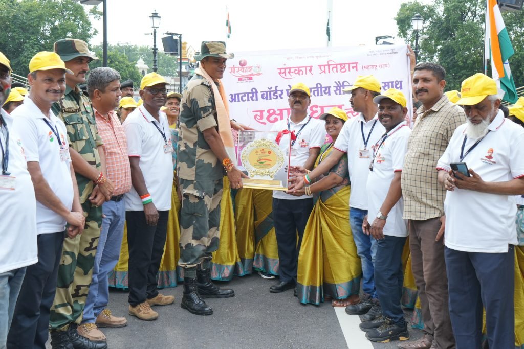 संस्कार प्रतिष्ठांच्या वतीने बीएसएफ च्या उत्कृष्ट कार्याबद्दल सन्मानचिन्ह व शाल देऊन बीएसएफच्या जवानांना संस्थेचे अध्यक्ष डॉक्टर मोहन गायकवाड आणि सर्व पदाधिकारी यांच्या हस्ते सन्मानित करण्यात आले या रक्षाबंधनामध्ये महाराष्ट्राच्या कानाकोपऱ्यातून संस्थेच्या 80 सभासद महिलांनी सहभाग घेतला होता रक्षाबंधन करताना महिलांचे आनंदाश्रू अनावर झाले असिस्टंट कमांडंट गौरव शर्मा सर यांनी सर्व महिलांचे कौतुक केले प्रत्यक्ष आम्ही आमच्या घरी जाऊन बहिणींच्या हस्ते राखी बांधू शकत नाही कारण आम्हाला आमचं कर्तव्य महत्त्वाचं असतं अशावेळी आपण येऊन आम्हाला राखी बांधता याचा आम्हाला खूप आनंद होतो आपण गेली सात वर्ष अटारी बॉर्डर येथे येऊन रक्षाबंधन करत आहात खूप कौतुकास्पद आपण सण साजरा करत असता यावेळी इन्स्पेक्टर अखिलेश कुमार सब इंस्पेक्टर विजयकुमार उपस्थित होते यामध्ये राजापूर कोल्हापूर सातारा पंढरपूर बारामती दौंड पुणे शहर पिंपरी चिंचवड शहर चिपळूण गणपतीपुळे रत्नागिरी येथून महिलांचा सहभाग होता या रक्षाबंधन चे संयोजन डॉक्टर मोहन गायकवाड यांच्या मार्गदर्शनाखाली राजेंद्र फडतरे मनोहर कड आनंद पुजारी प्रिया पुजारी सायली सुर्वे संध्या स्वामी रेवती जरग श्रुती ताम्हणकर मानसी कदम सचिन जरग यांनी केले होते
