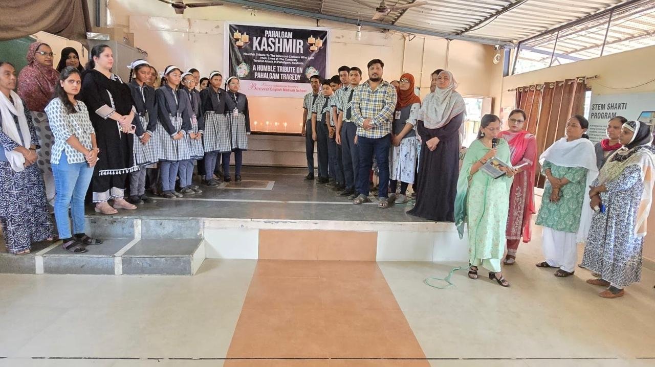 पिंपरी, (महाराष्ट्र ब्रेकिंग न्यूज) – बीना इंग्लिश मीडियम स्कूल, पांढारकरनगर, आकुर्डी येथे शुक्रवार, दिनांक २५ एप्रिल २०२५ रोजी काश्मीरमधील पहलगाम येथील दहशतवादी हल्ल्यात मृत्युमुखी पडलेल्यांना भावपूर्ण श्रद्धांजली वाहण्यात आली. कार्यक्रमाच्या अध्यक्षस्थानी बीना एज्युकेशनल सोसायटीचे संस्थापक – अध्यक्ष इकबाल खान होते. श्रद्धांजली अर्पण करताना मृत व्यक्तींच्या शोकाकूल परिवाराच्या दुःखात आम्हीही सहभागा आहेत, अशी भावना प्रकट करण्यात आली.