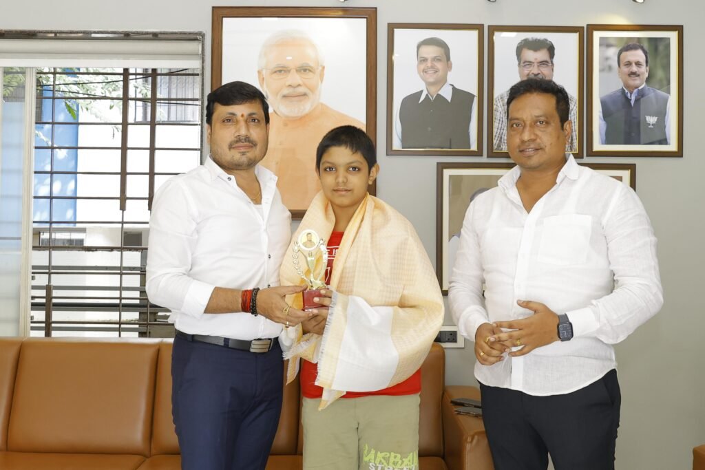 या उल्लेखनीय यशाबद्दल भाजप पिंपरी-चिंचवड शहराध्यक्ष श्री शत्रुघ्न काटे यांनी कु.आत्मजचा शाल आणि ट्रॉफी देऊन सन्मान केला. या प्रसंगी आत्मजचे आई प्रियांका पराग जैन तसेच श्री दिपक नागरगोजे आणि स्थानिक मान्यवर उपस्थित होते.