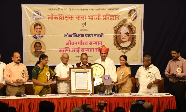 पाली – मराठी भाषेचे पहिले शब्दकोशकार बाबा भारती यांच्या जन्मशताब्दीनिमित्त लोकशिक्षक बाबा भारती प्रतिष्ठान आयोजित जीवनगौरव पुरस्कार प्रदान करताना डाॅ. श्रीपाल सबनीस बोलत होते. माजी खासदार रामशेठ ठाकूर कार्यक्रमाच्या अध्यक्षस्थानी होते; तसेच रयत शिक्षण संस्थेचे सचिव विकास देशमुख, सहसचिव प्राचार्य डॉ. शिवलिंग मेनकुदळे, सहसचिव प्राचार्य डॉ. राजेंद्र मोरे, सहसचिव बंडू पवार, पद्मा दळवी आणि लोकशिक्षक बाबा भारती प्रतिष्ठानचे अध्यक्ष महेंद्र भारती यांची व्यासपीठावर प्रमुख उपस्थिती होती. याप्रसंगी माजी सनदी अधिकारी आणि रयत शिक्षण संस्थेचे चेअरमन चंद्रकांत दळवी यांना लोकशिक्षक बाबा भारती जीवनगौरव; तसेच ज्येष्ठ लेखिका ललिता सबनीस यांना श्रीमती सखुबाई जगन्नाथ भारती आई सन्मान प्रदान करून गौरविण्यात आले.