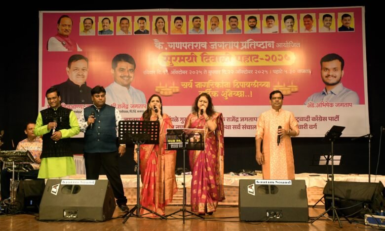 पिंपरी, (महाराष्ट्र ब्रेकिंग न्यूज) – कै. गणपतराव जगताप प्रतिष्ठान व माजी नगरसेवक राजेंद्र जगताप मित्र परिवाराच्या वतीने आयोजित सुरमयी दिवाळी पहाट कार्यक्रमात गायिका पल्लवी पत्की-ढोले, गायक संदीप चाबुकस्वार, जयश्री करंबेळकर – ठाणेकर, गायक आकाश सोळंकी यांनी रसिकांना सकाळच्या प्रहरी गुलाबी थंडीत मंत्रमुग्ध केले.