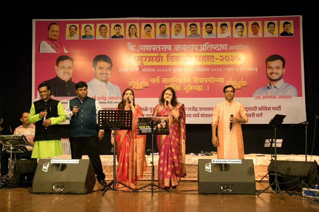 पिंपरी, (महाराष्ट्र ब्रेकिंग न्यूज) – कै. गणपतराव जगताप प्रतिष्ठान व माजी नगरसेवक राजेंद्र जगताप मित्र परिवाराच्या वतीने आयोजित सुरमयी दिवाळी पहाट कार्यक्रमात गायिका पल्लवी पत्की-ढोले, गायक संदीप चाबुकस्वार, जयश्री करंबेळकर – ठाणेकर, गायक आकाश सोळंकी यांनी रसिकांना सकाळच्या प्रहरी गुलाबी थंडीत मंत्रमुग्ध केले.