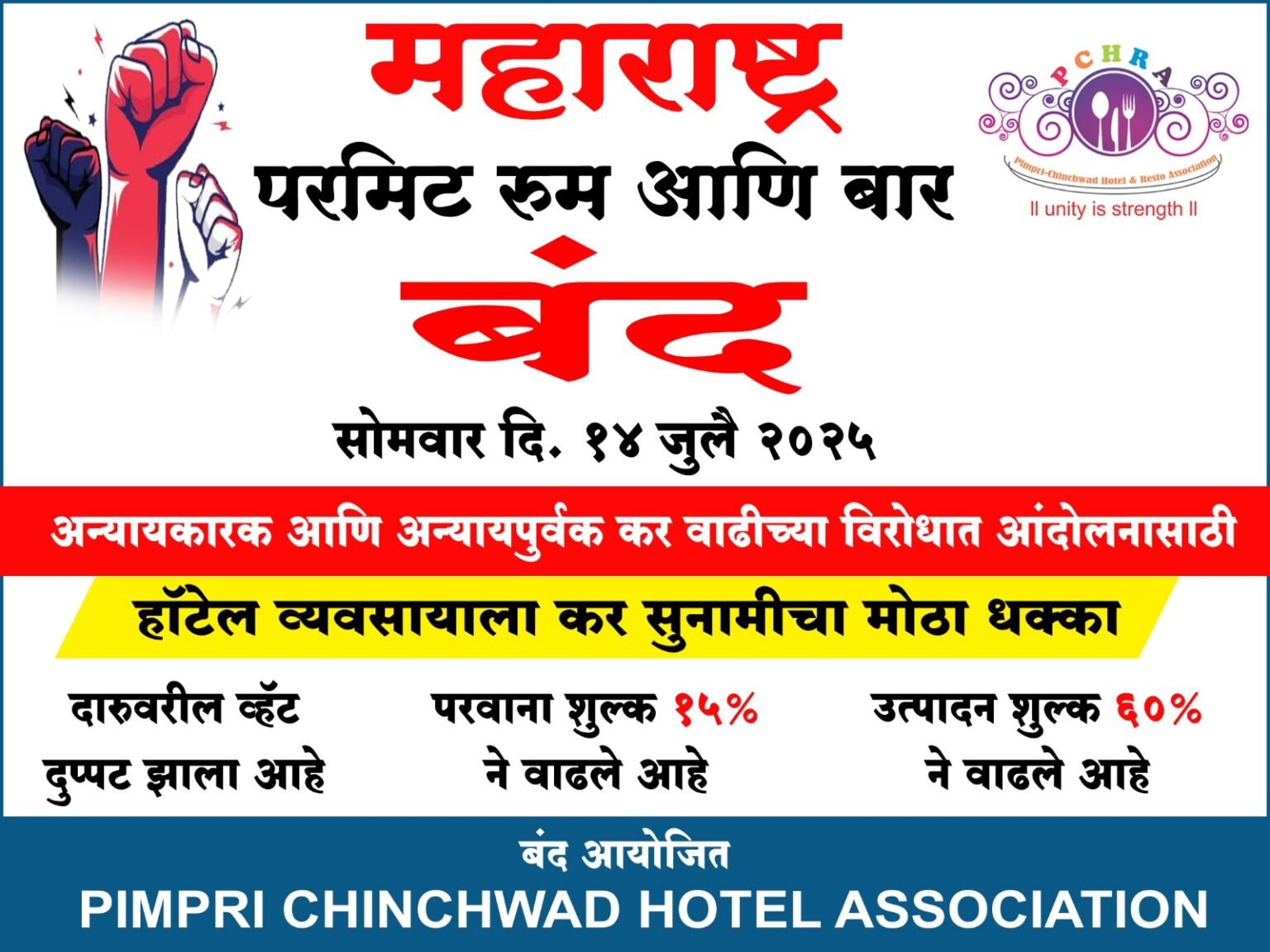 कोरोना काळापासून संपूर्ण हॉस्पिटेलिटी उद्द्योग मोठ्या आर्थिक नुकसानीला सामोरा जात आहे. याकडे सरकारने दुर्लक्ष केले आहे. आता सोमवारी संपूर्ण महाराष्ट्रातील परवानाधारक हॉटेल आणि बार अँड रेस्टॉरंट बंद करण्याशिवाय पर्याय नाही. हा सरकारच्या दंडात्मक करव्यवस्थेचा निषेध करीत पिंपरी चिंचवड शहरातील सर्व हॉटेल्स व्यावसायिक या बंदमध्ये सहभागी होणार आहेत असे पत्र पिंपरी चिंचवड हॉटेल असोसिएशनच्या वतीने प्रसिद्धीस देण्यात आले आहे.