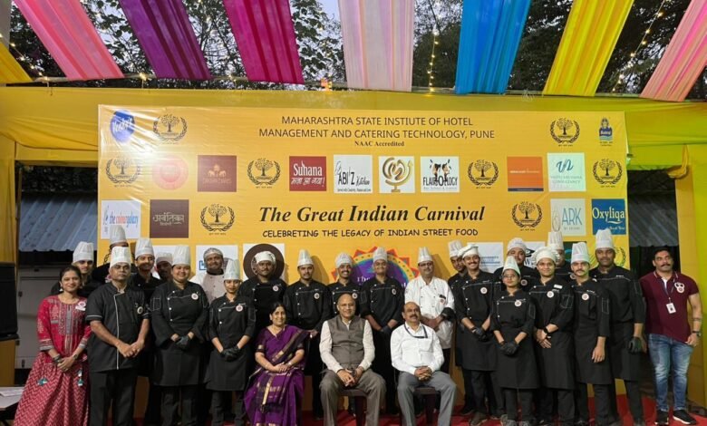 पुणे, (महाराष्ट्र ब्रेकिंग न्यूज) – महाराष्ट्र राज्य हॉटेल मॅनेजमेंट आणि केटरिंग टेक्नॉलॉजी संस्था (डिग्री), पुणे येथे “द ग्रेट इंडियन कार्निव्हल – भारतीय खाद्यपरंपरेचा गौरव” या भव्य खाद्य महोत्सवाचे नुकतेच आयोजन संस्थेच्या खुल्या प्रांगणात यशस्वीरित्या करण्यात आले. अंतिम वर्षाच्या बीएचएमसीटी (बॅच २०२२) विद्यार्थ्यांनी संपूर्णपणे संकल्पना मांडून साकारलेला हा महोत्सव अतिथींमध्ये उत्साह निर्माण करणारा ठरला. भारतीय गल्ल्यांतील चवी, सुगंध आणि संवादांनी परिसर उत्सवमय वातावरणात न्हाऊन गेला आणि सुमारे २०० हून अधिक पाहुण्यांनी या कार्यक्रमात सहभाग घेतला.