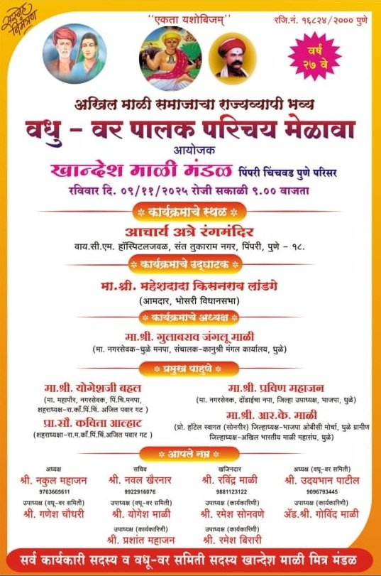 पिंपरीतील आचार्य अत्रे रंगमंदिर येथे रविवारी (दि. ९ नोव्हेंबर) रोजी सकाळी १० वाजता आयोजित करण्यात आला आहे. या मेळाव्याचे उद्घाटन आचार्य अत्रे रंगमंदिर, संत तुकाराम नगर, पिंपरी येथे आमदार महेश दादा लांडगे यांच्या हस्ते सकाळी १० वाजता होणार असून अध्यक्ष धुळे महानगरपालिकेचे माजी नगरसेवक गुलाबराव माळी आणि प्रमुख पाहुणे माजी महापौर योगेश बहल, ज्येष्ठ सामाजिक कार्यकर्ते प्रवीण महाजन, राष्ट्रवादी काँग्रेस महिला शहराध्यक्ष कविता आल्हाट, अखिल भारतीय माळी महासंघ धुळे जिल्हाध्यक्ष आर. के. माळी, मंडळाचे संस्थापक एस.के.माळी,ज्येष्ठ सल्लागार पी. के. महाजन, नाना भाऊ माळी, भीमराव माळी, उद्धव महाजन, किशोर वाघ, शिवाजी माळी आदी उपस्थित राहणार आहेत.