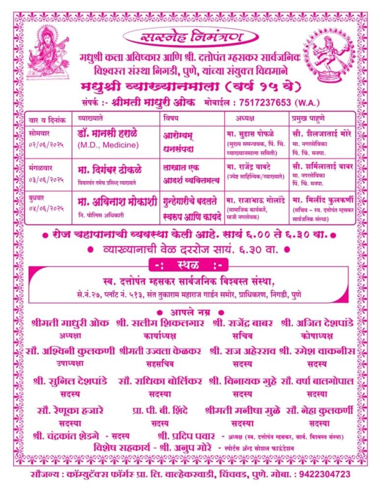 पिंपरी (महाराष्ट्र ब्रेकिंग न्यूज) – मधुश्री कला आविष्कार आणि दत्तोपंत म्हसकर सार्वजनिक विश्वस्त संस्था निगडी यांच्या संयुक्त विद्यमाने आयोजित तीन दिवसीय मधुश्री व्याख्यानमालेचा प्रारंभ सोमवार, दिनांक ०२ जून २०२५ रोजी होणार आहे. स्वर्गीय दत्तोपंत म्हसकर सार्वजनिक विश्वस्त संस्था सभागृह, प्लॉट क्रमांक ५१३, पेठ क्रमांक २७, संत तुकाराममहाराज उद्यानासमोर, प्राधिकरण, निगडी येथे दररोज सायंकाळी ठीक ०६:३० वाजता व्याख्यानाला सुरवात होईल.