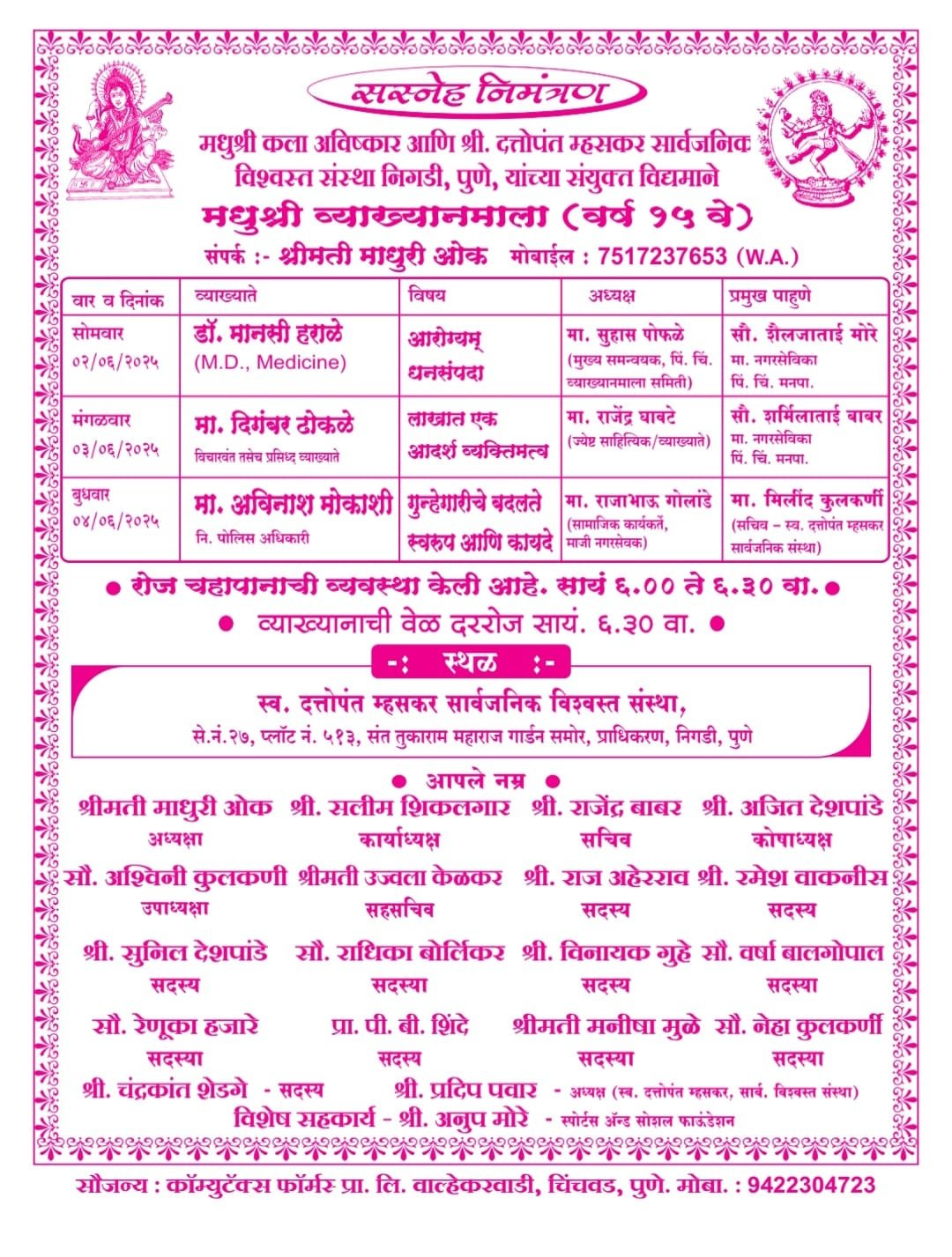पंधराव्या वर्षात पदार्पण करीत असलेल्या मधुश्री व्याख्यानमालेत सोमवार, दिनांक ०२ जून रोजी डॉ. मानसी हराळे ‘आरोग्यम् धनसंपदा’ या विषयावर प्रथम पुष्पाची गुंफण करतील. पिंपरी – चिंचवड व्याख्यानमाला प्रमुख समन्वयक सुहास पोफळे यांची अध्यक्ष आणि माजी उपमहापौर शैलजा मोरे प्रमुख पाहुण्या म्हणून यावेळी उपस्थिती राहील.