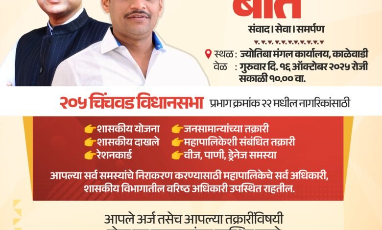 चिंचवड (महाराष्ट्र ब्रेकिंग न्यूज) –  चिंचवड विधानसभा मतदारसंघातील प्रभाग क्रमांक 22 मधील नागरिकांसाठी लोकप्रिय आमदार शंकर जगताप यांच्या पुढाकारातून “जन की बात संवाद | सेवा | समर्पण” या विशेष कार्यक्रमाचे आयोजन करण्यात आले आहे.