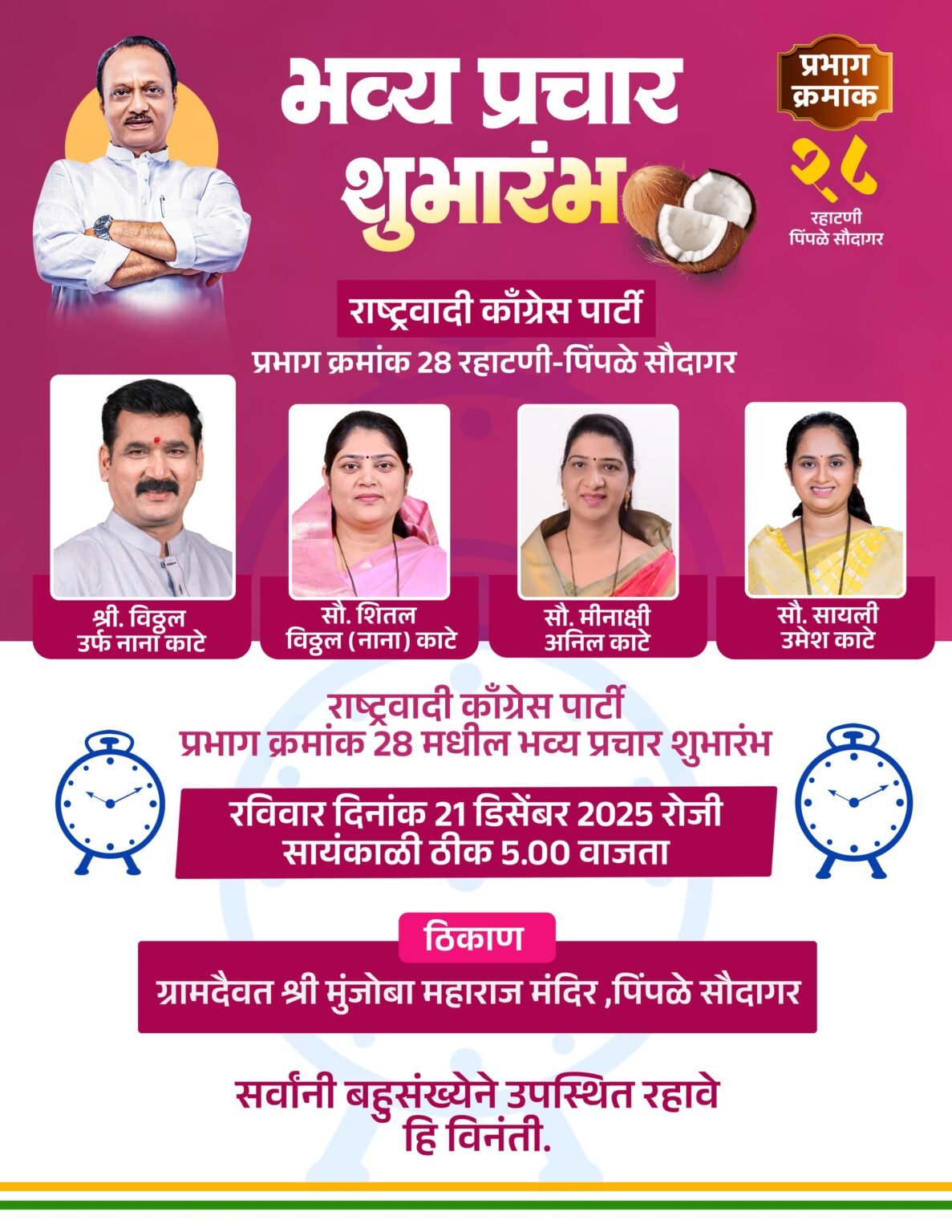 पिंपरी, (महाराष्ट्र ब्रेकिंग न्यूज) – पिंपरी-चिंचवड महापालिका निवडणूक २०२६ च्या पार्श्वभूमीवर राष्ट्रवादी काँग्रेस पक्षाने प्रभाग क्रमांक २८ (रहाटणी–पिंपळे सौदागर) येथे आपल्या प्रचाराचा भव्य शुभारंभ जाहीर केला आहे. रविवार, दिनांक २१ डिसेंबर २०२५ रोजी सायंकाळी ठीक ५ वाजता ग्रामदैवत श्री मुंजोबा महाराज मंदिर, पिंपळे सौदागर येथे हा प्रचार शुभारंभ सोहळा पार पडणार आहे.