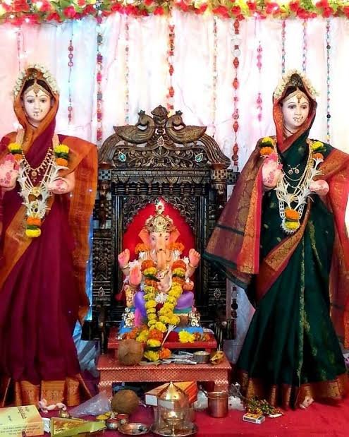 काही घरांमध्ये गौरींचे शाडूचे मुखवटे तर, काही घरांमध्ये पितळी मुखवटे बसवून गौरी बसविल्या आहेत.