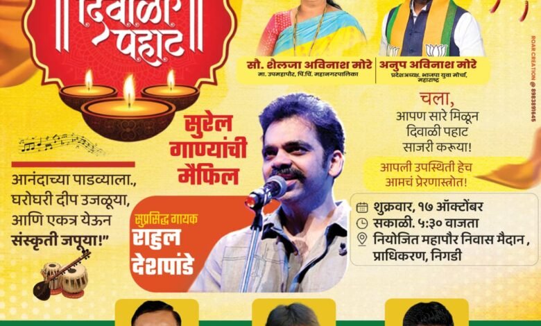 शुक्रवार, दिनांक १७ ऑक्टोबर २०२५ रोजी पहाटे ५:३० वाजता नियोजित महापौर निवास मैदान, निगडी प्राधिकरण येथे होणाऱ्या कार्यक्रम विनाशुल्क असलेल्या या सुश्राव्य मैफलीचा लाभ सर्व नागरिकांनी आवर्जून घ्यावा, असे आवाहन आयोजक माजी उपमहापौर शैलजा मोरे आणि भाजपा युवा मोर्चा महाराष्ट्र प्रदेशाध्यक्ष अनुप मोरे, भाजपा पदाधिकारी सलीम शिकलगार, अरुण थोरात आणि अतुल इनामदार यांनी केले आहे.