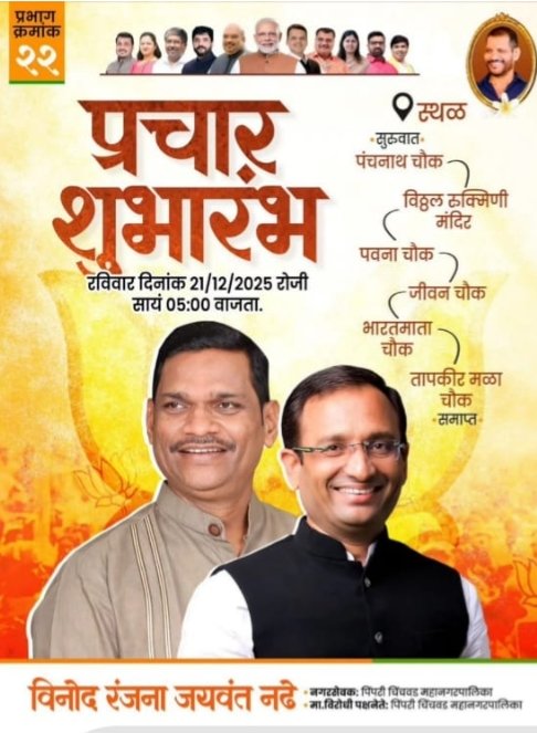 हि भव्य प्रचार रॅली आज (दि.२१) सायंकाळी ५ वाजता आयोजित करण्यात आली आहे. या प्रचार रॅलीची सुरुवात काळेवाडी येथील पंचनाथ चौक येथून होणार असून, रॅलीचा मार्ग विठ्ठल-रुक्मिणी मंदिर, पवना चौक, जीवन चौक, भारतमाता चौक असा असणार आहे. रॅलीचा समारोप तापकीर मळा चौक येथे होणार आहे. या प्रचार शुभारंभ रॅलीत महापालिकेतील सत्ताधारी व विरोधी पक्षातील प्रमुख नेते, पदाधिकारी, कार्यकर्ते तसेच नागरिक मोठ्या संख्येने सहभागी होणार असल्याची माहिती विनोद नढे यांच्याकडून देण्यात आली आहे.