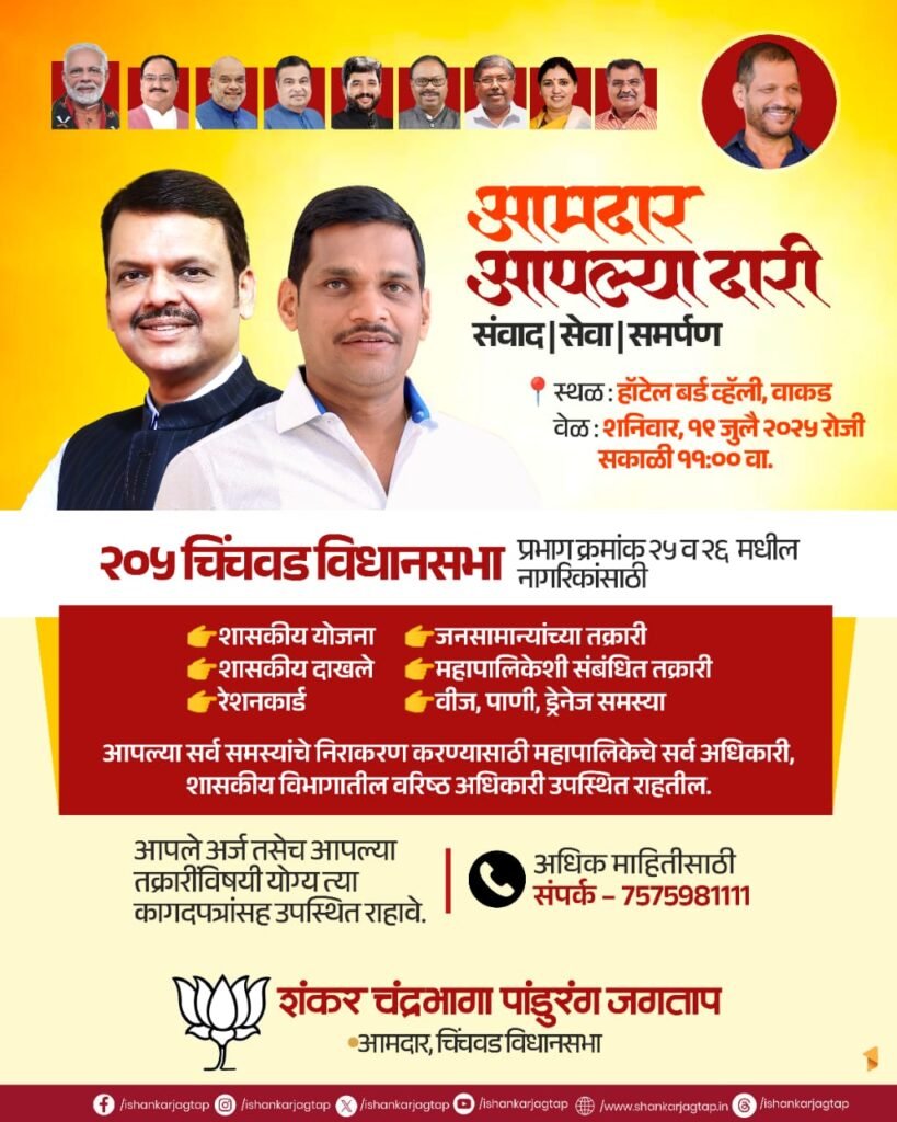 वाकड, (महाराष्ट्र ब्रेकिंग न्यूज) – चिंचवड विधानसभा मतदारसंघाचे आमदार शंकर जगताप यांच्या पुढाकाराने “आमदार आपल्या दारी” हा उपक्रम राबवण्यात येत आहे. या अंतर्गत चिंचवड मतदारसंघातील वाकड भागातील नागरिकांच्या समस्या थेट आमदारांच्या उपस्थितीत आणि विविध शासकीय अधिकाऱ्यांच्या समवेत ऐकल्या जाणार आहेत.